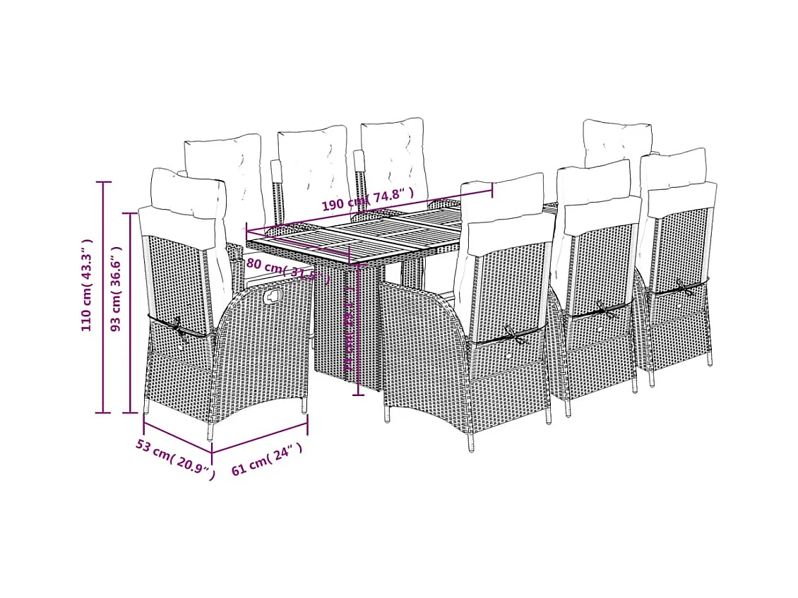 Ensemble à manger de jardin 9pcs coussins noir résine tressée