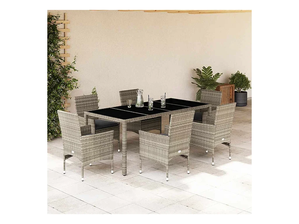 Ensemble à manger de jardin et coussins 7 pcs gris rotin verre