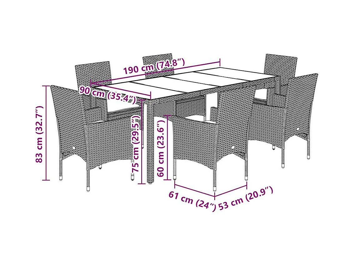 Ensemble à manger de jardin avec coussins 7 pièces rotin et verre