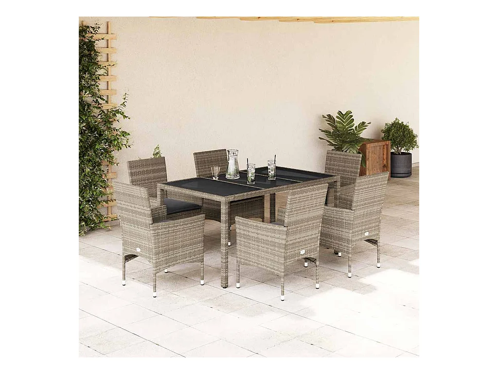 Ensemble à manger de jardin et coussins 7 pièces gris rotin verre
