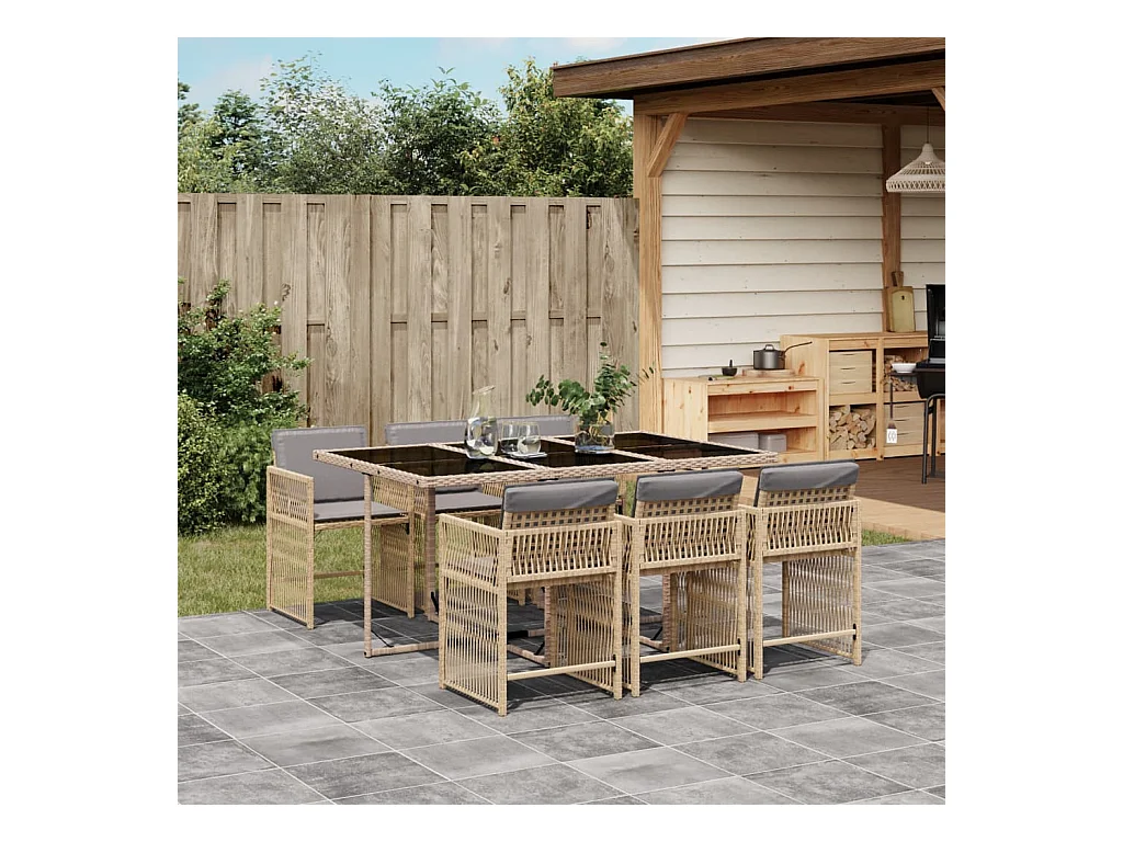 Ensemble à manger de jardin et coussins 7 pièces beige poly rotin