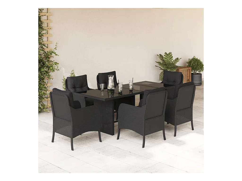 Ensemble à manger de jardin coussins 7 pièces Noir Résine tressée