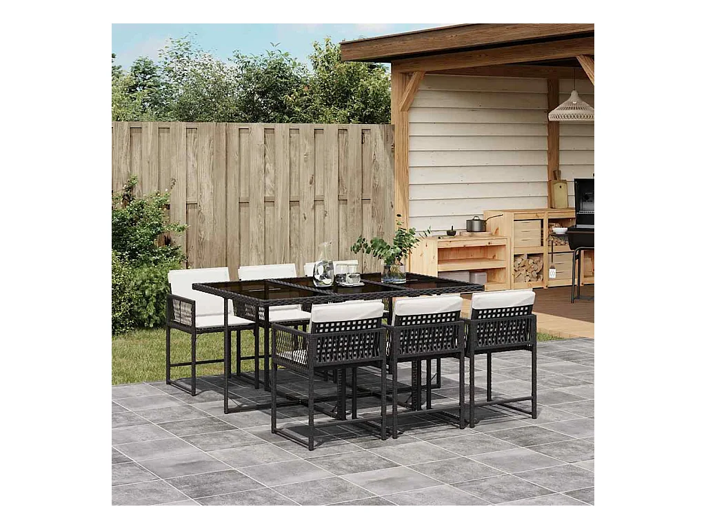 Ensemble à manger de jardin coussins 7 pièces noir résine tressée