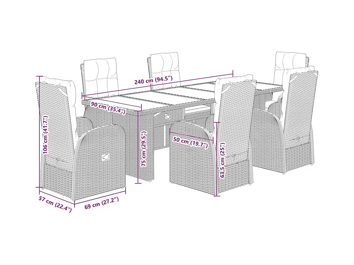 Ensemble à manger de jardin coussins 7 pièces noir résine tressée