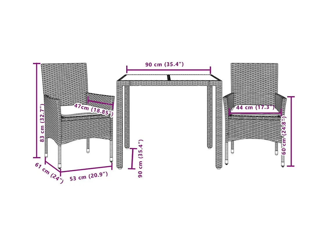 Ensemble à manger de jardin et coussins 3 pièces noir rotin verre