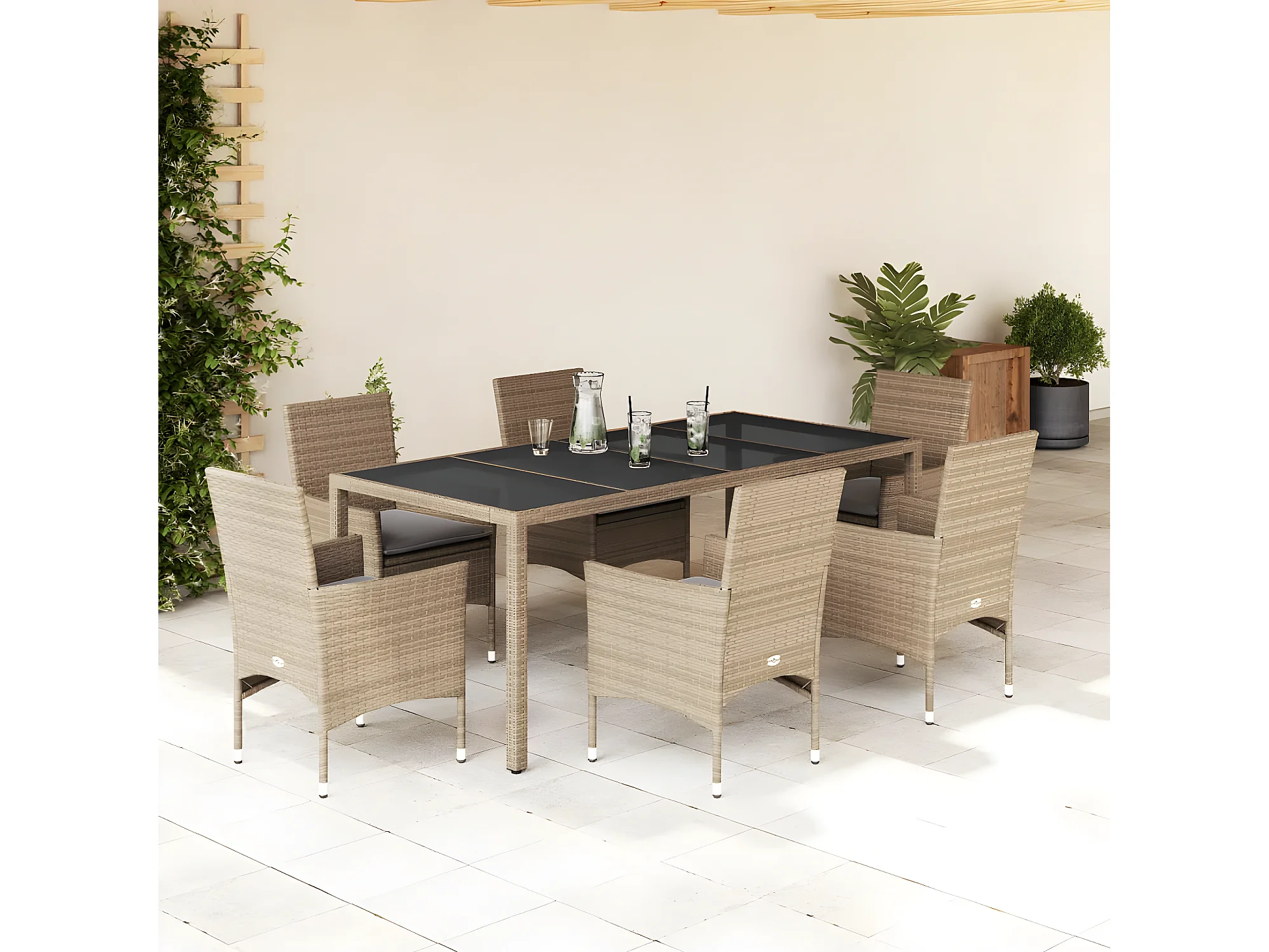 Ensemble à manger de jardin et coussins 7 pcs beige rotin verre
