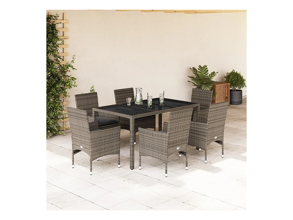 Ensemble à manger de jardin avec coussins 7 pcs rotin et verre