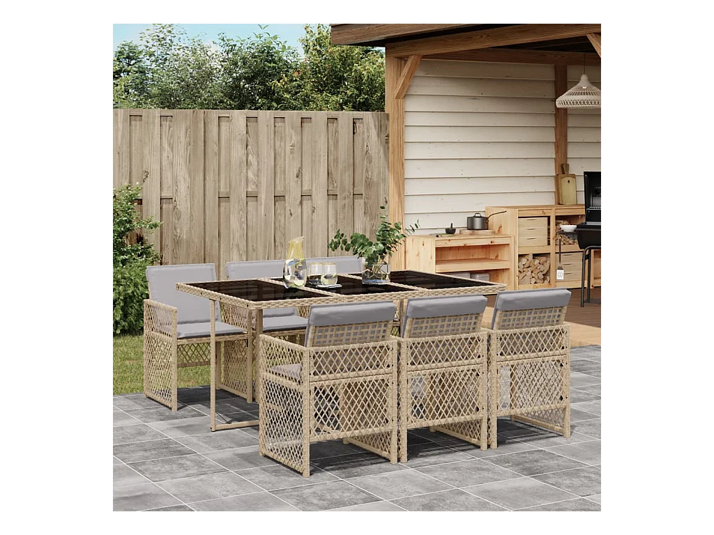 Ensemble à manger de jardin et coussins 7 pièces beige poly rotin