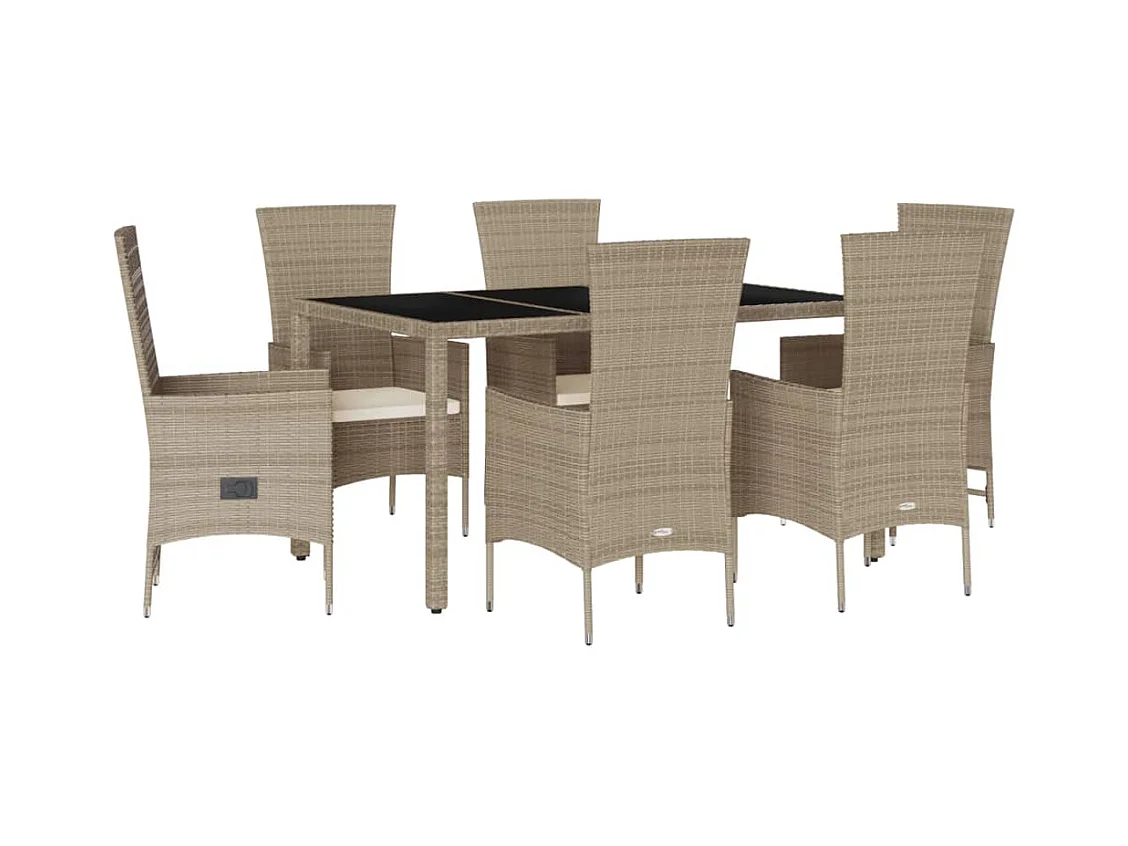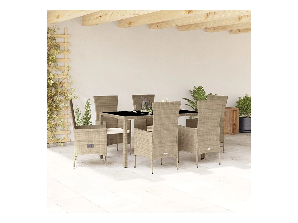 Ensemble à manger de jardin et coussins 7 pièces beige rotin verre