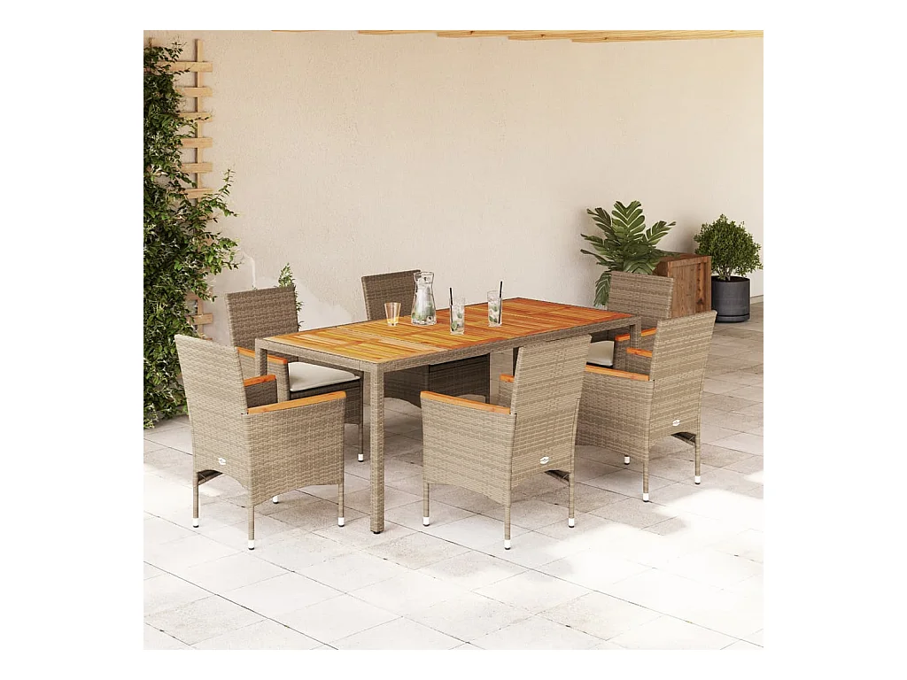 Ensemble à manger de jardin et coussins 7 pièces beige rotin acacia