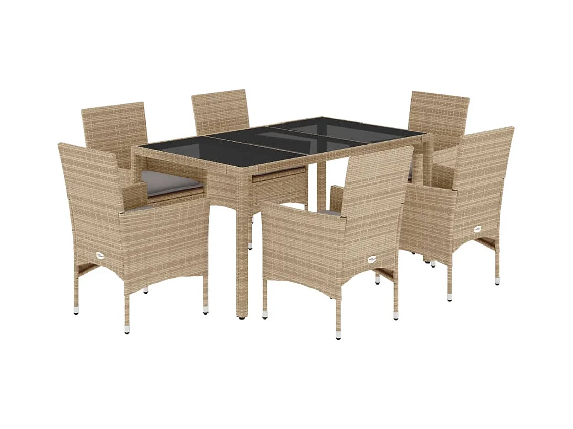 Ensemble à manger de jardin et coussins 7 pièces beige rotin verre