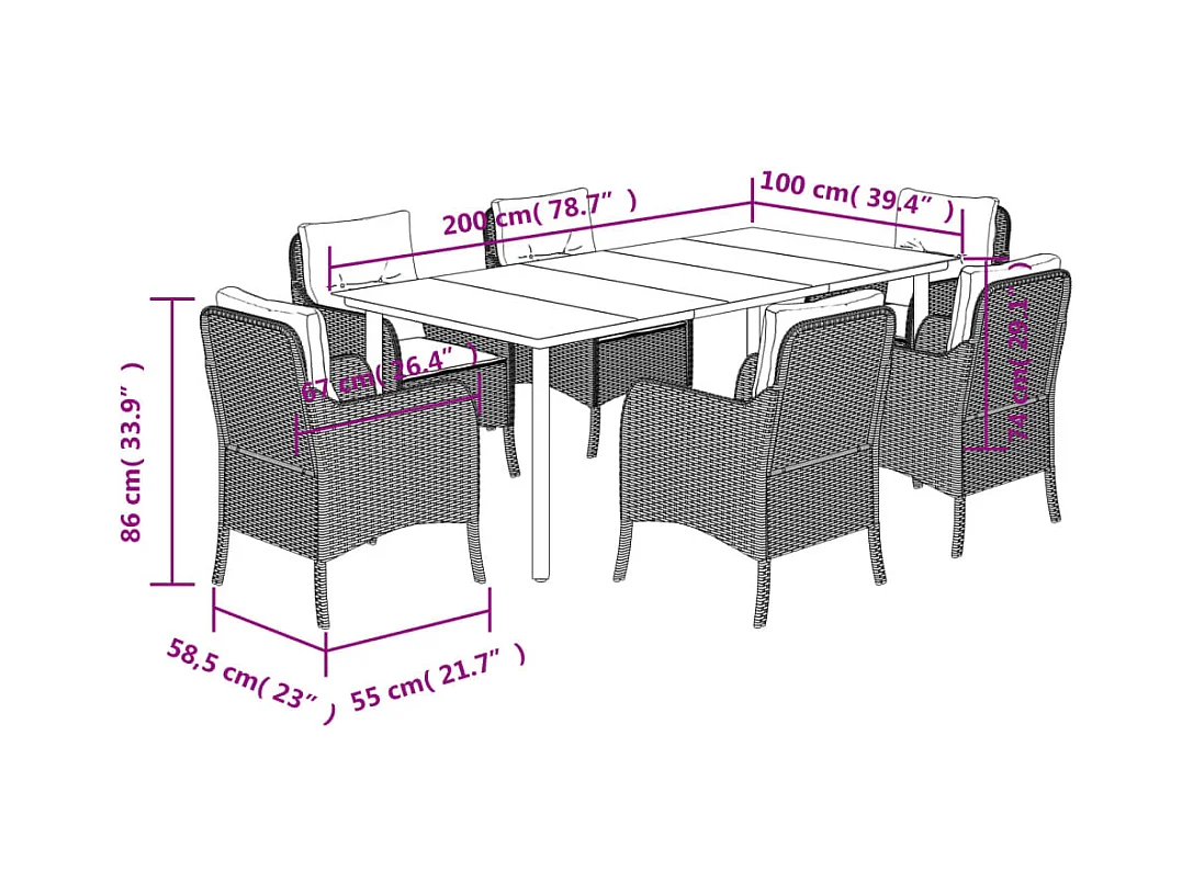 Ensemble à manger de jardin et coussins 7 pièces gris rotin
