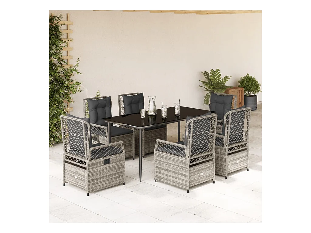 Ensemble à manger de jardin et coussins 7 pièces gris rotin verre