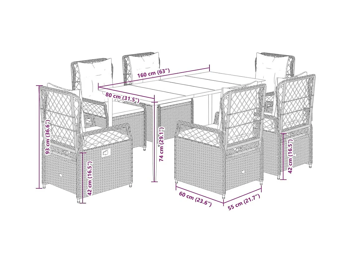 Ensemble à manger de jardin et coussins 7 pièces gris rotin