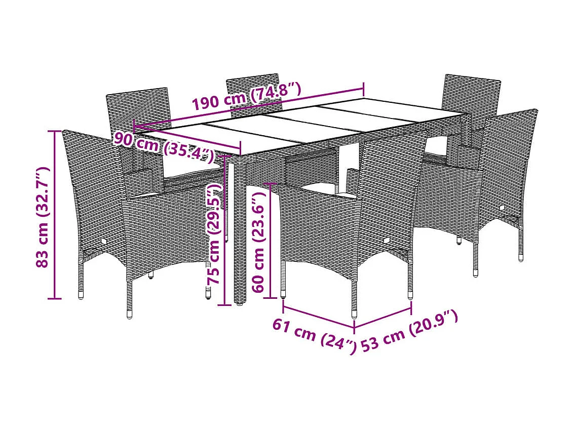 Ensemble à manger de jardin et coussins 7 pièces marron rotin verre