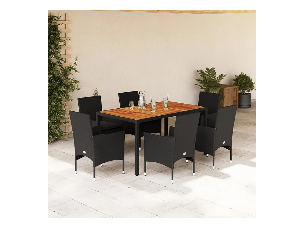 Ensemble à manger de jardin et coussins 7 pièces noir rotin acacia