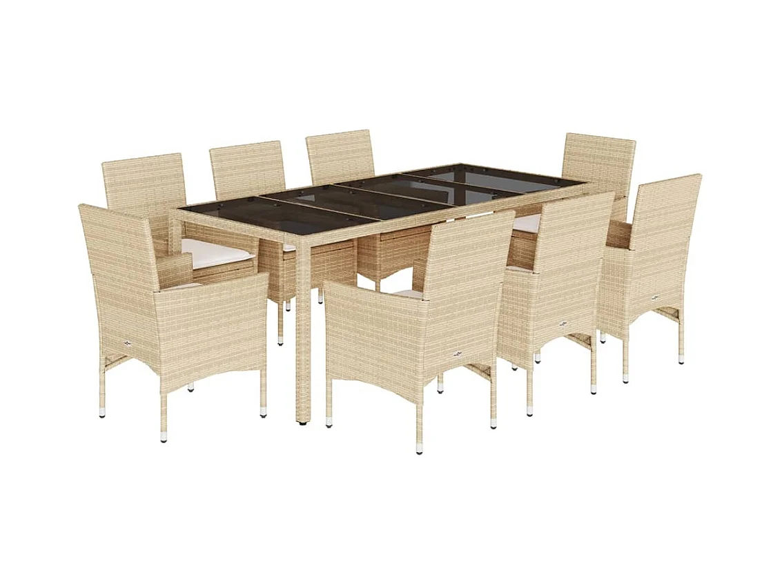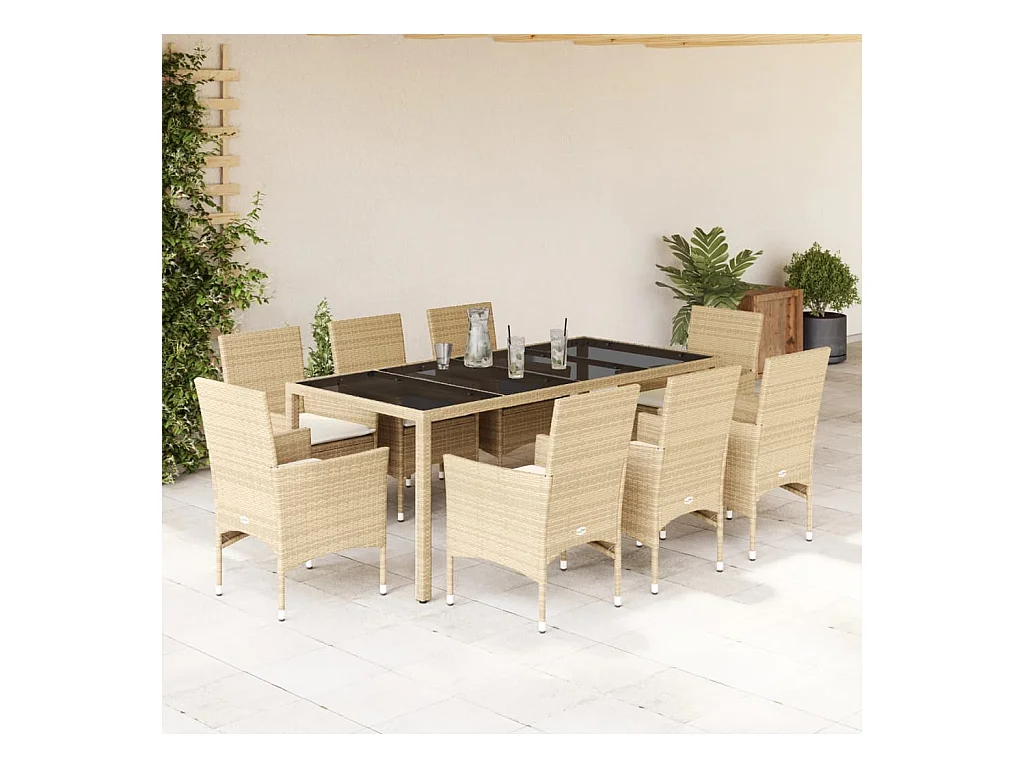 Ensemble à manger de jardin et coussins 9 pcs beige rotin verre