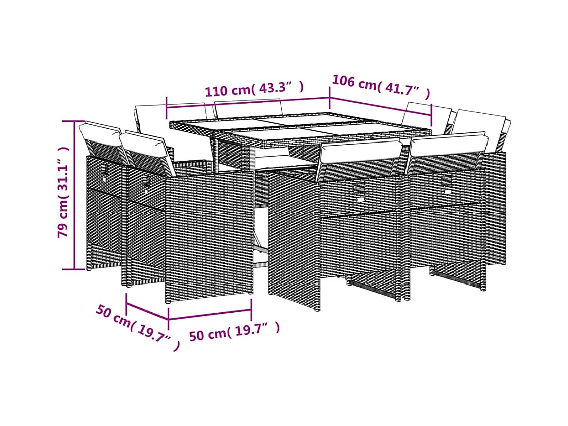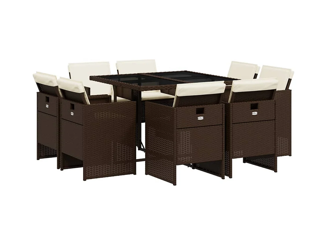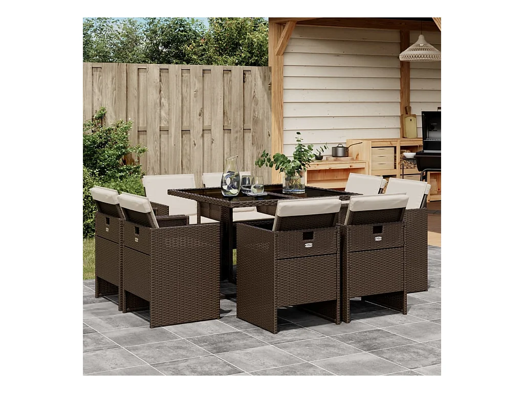 Ensemble à manger de jardin et coussins 9 pcs marron poly rotin