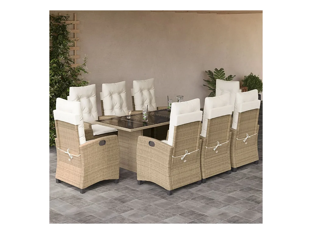 Ensemble à manger de jardin et coussins 9 pièces beige rotin verre