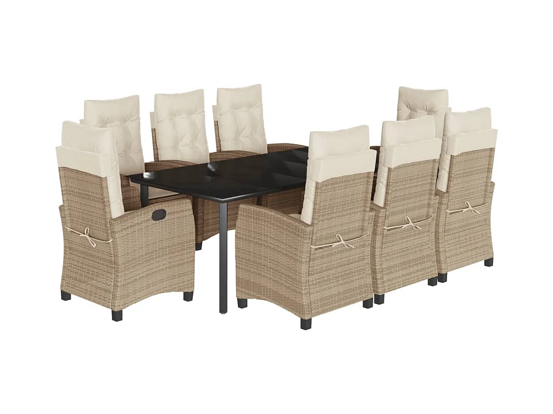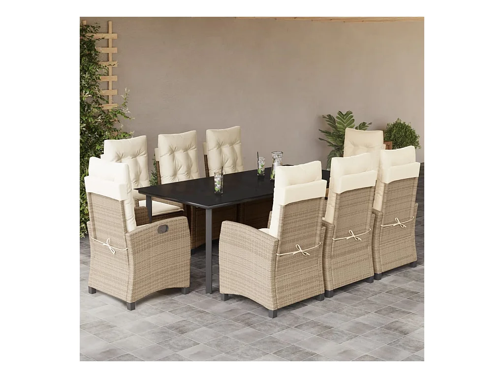 Ensemble à manger de jardin et coussins 9 pièces beige rotin verre
