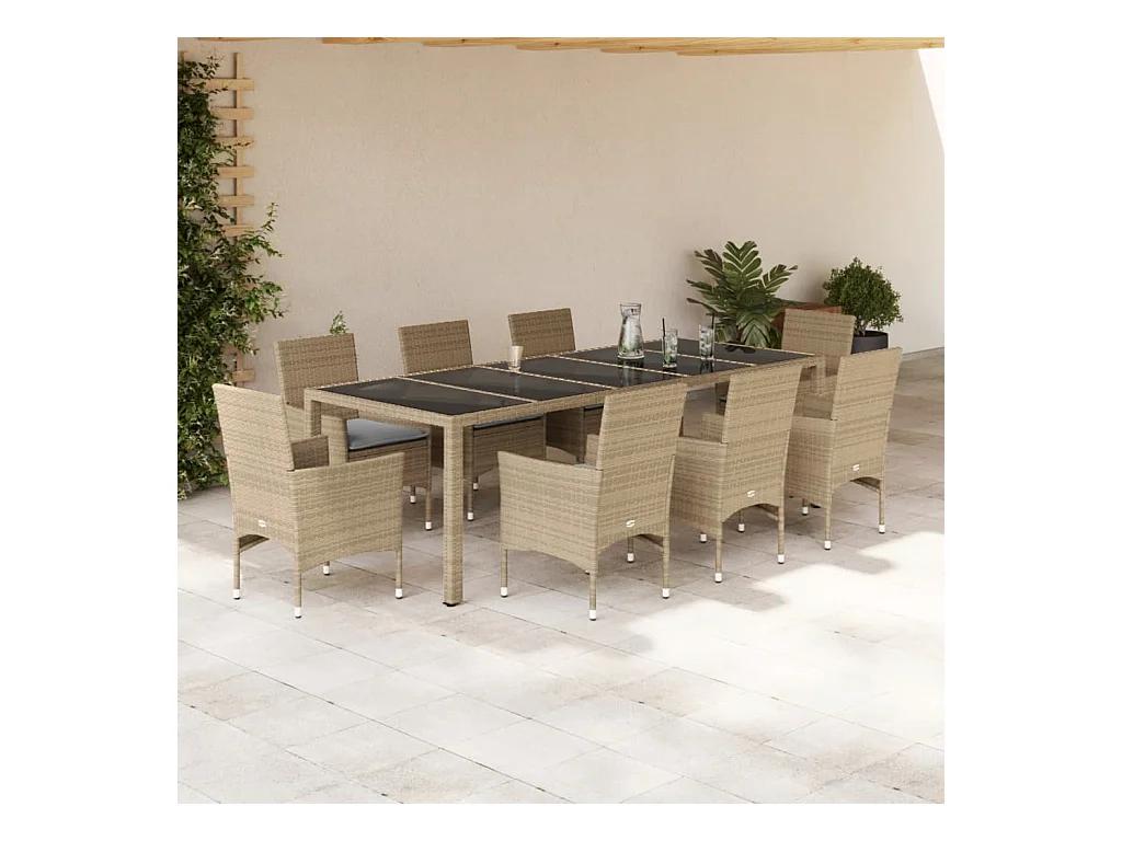 Ensemble à manger de jardin et coussins 9 pièces beige rotin verre