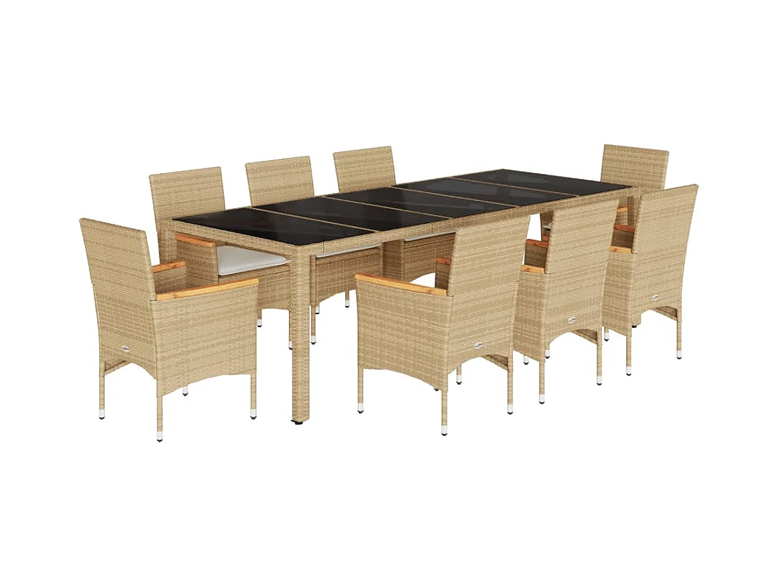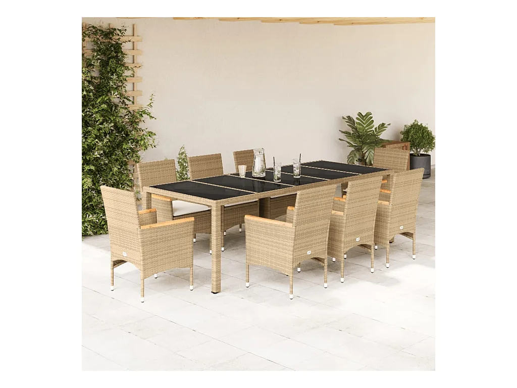 Ensemble à manger de jardin et coussins 9 pièces beige rotin verre