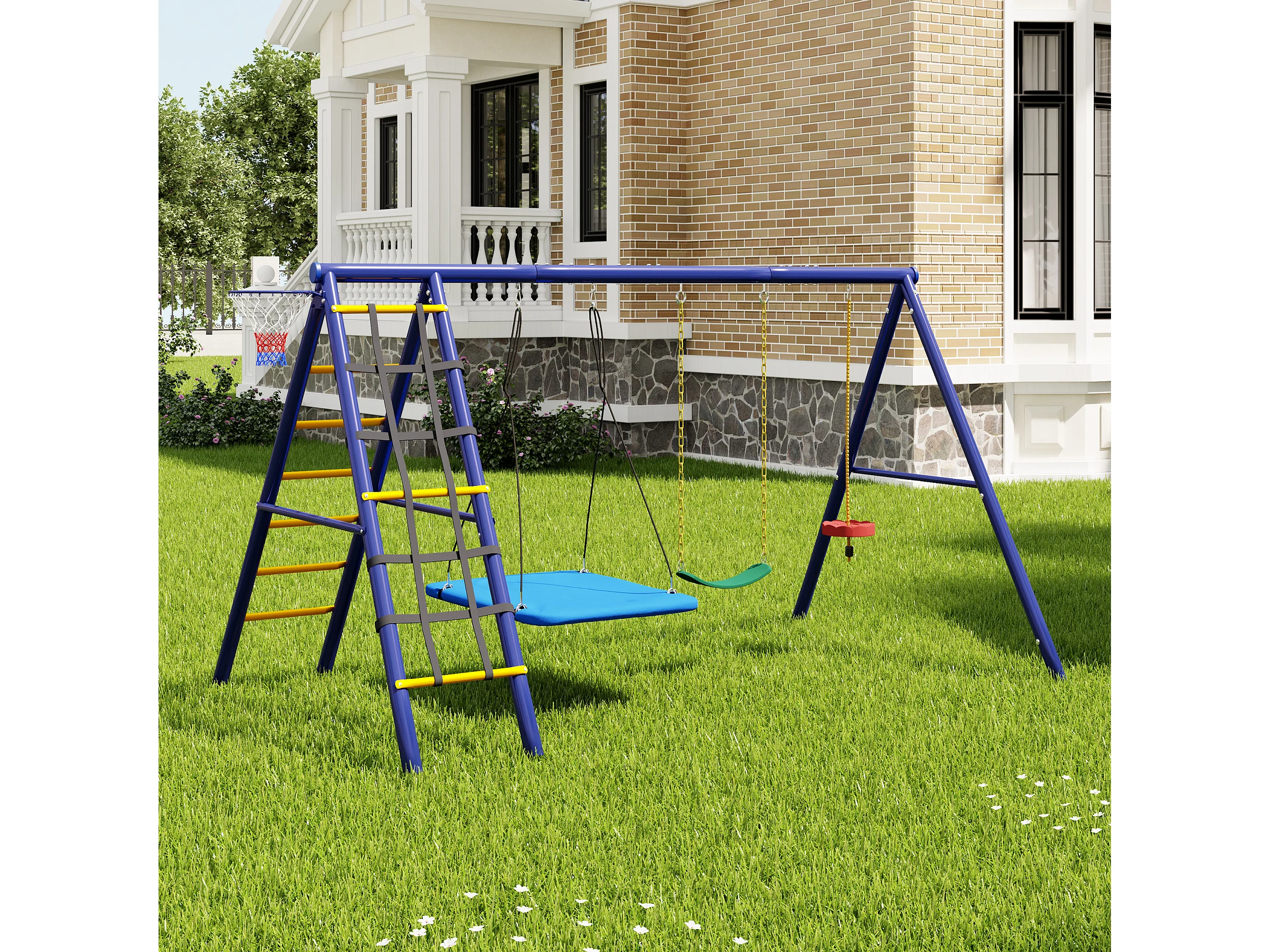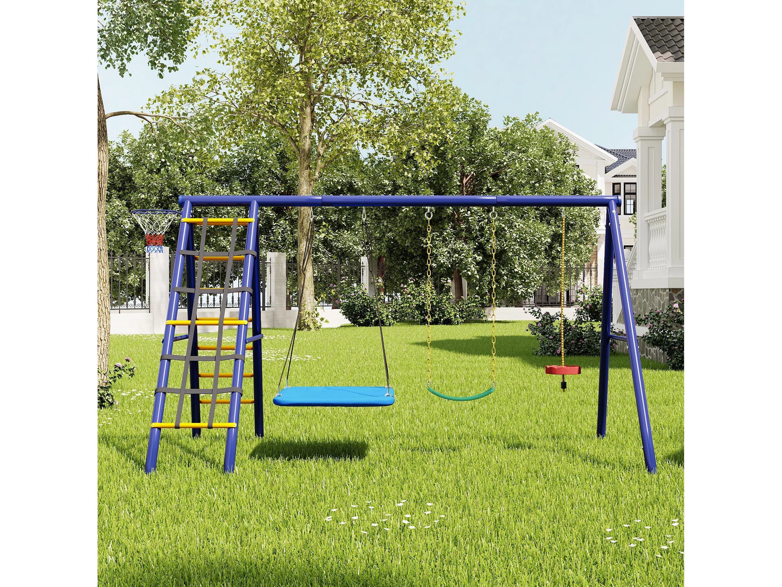 Ensemble balançoire extérieur en acier bleu - 3 balançoires + structure à grimper + panier