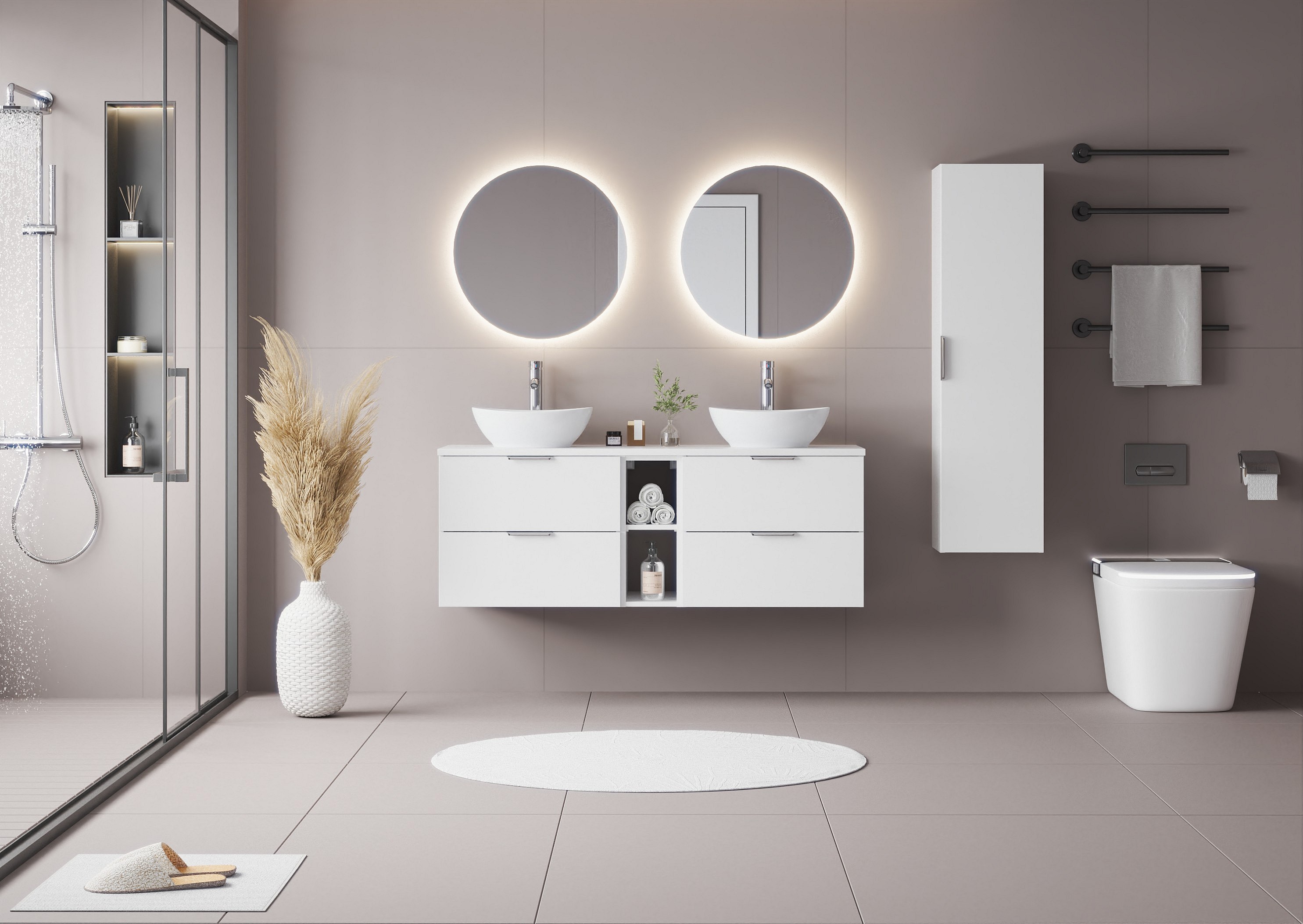 Ensemble blanc pour salle de bain 140 cm Armoire Étagère Plan de travail Lavabo Pile
