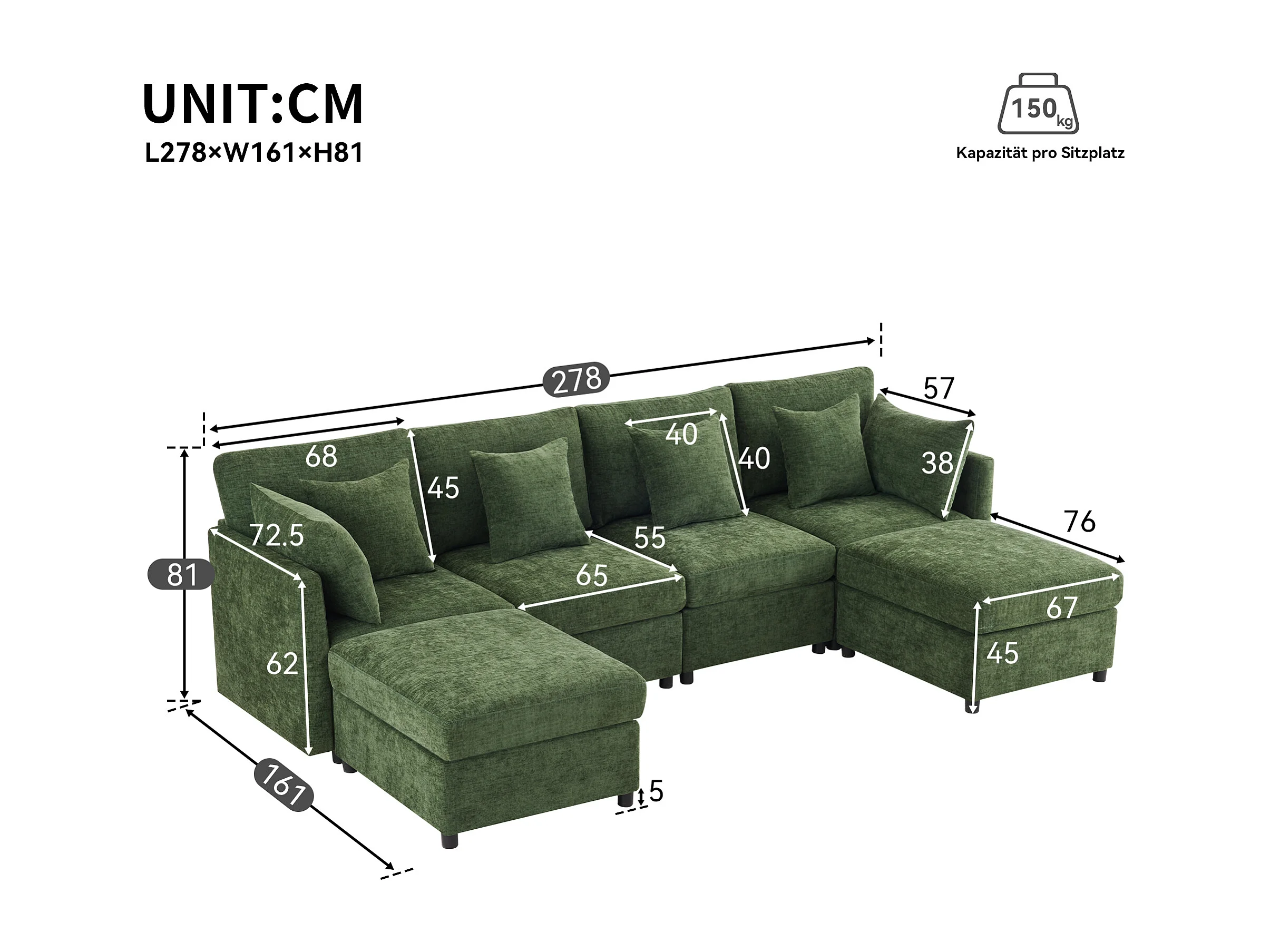 Ensemble canapé moderne 4 places - 278 x 161 x 81 cm - avec repose-pieds amovible + 6 coussins - velours - vert