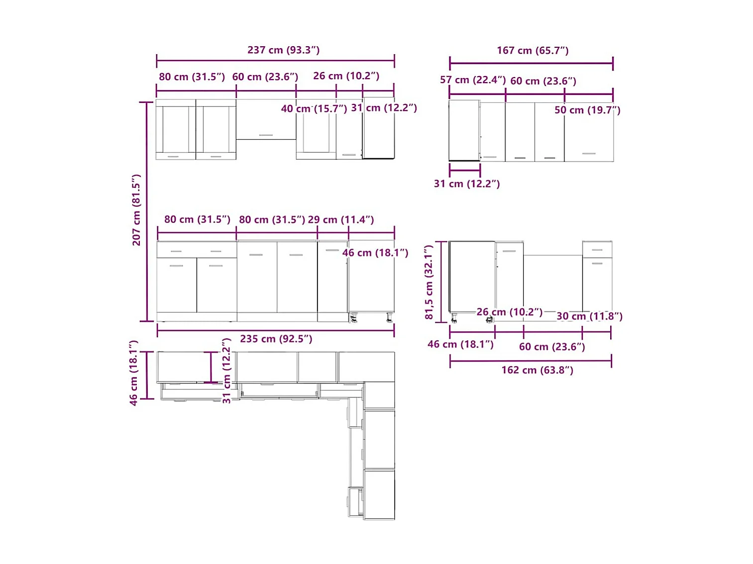 Ensemble de 11 meubles de cuisine "Lyon" en bois d'ingénierie vieilli