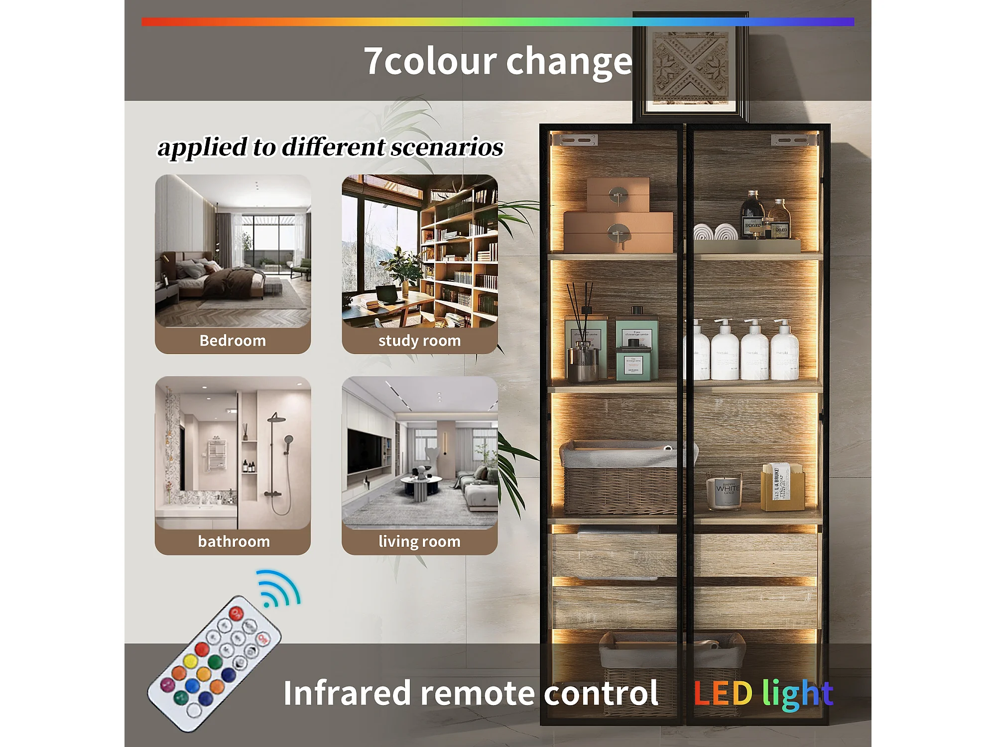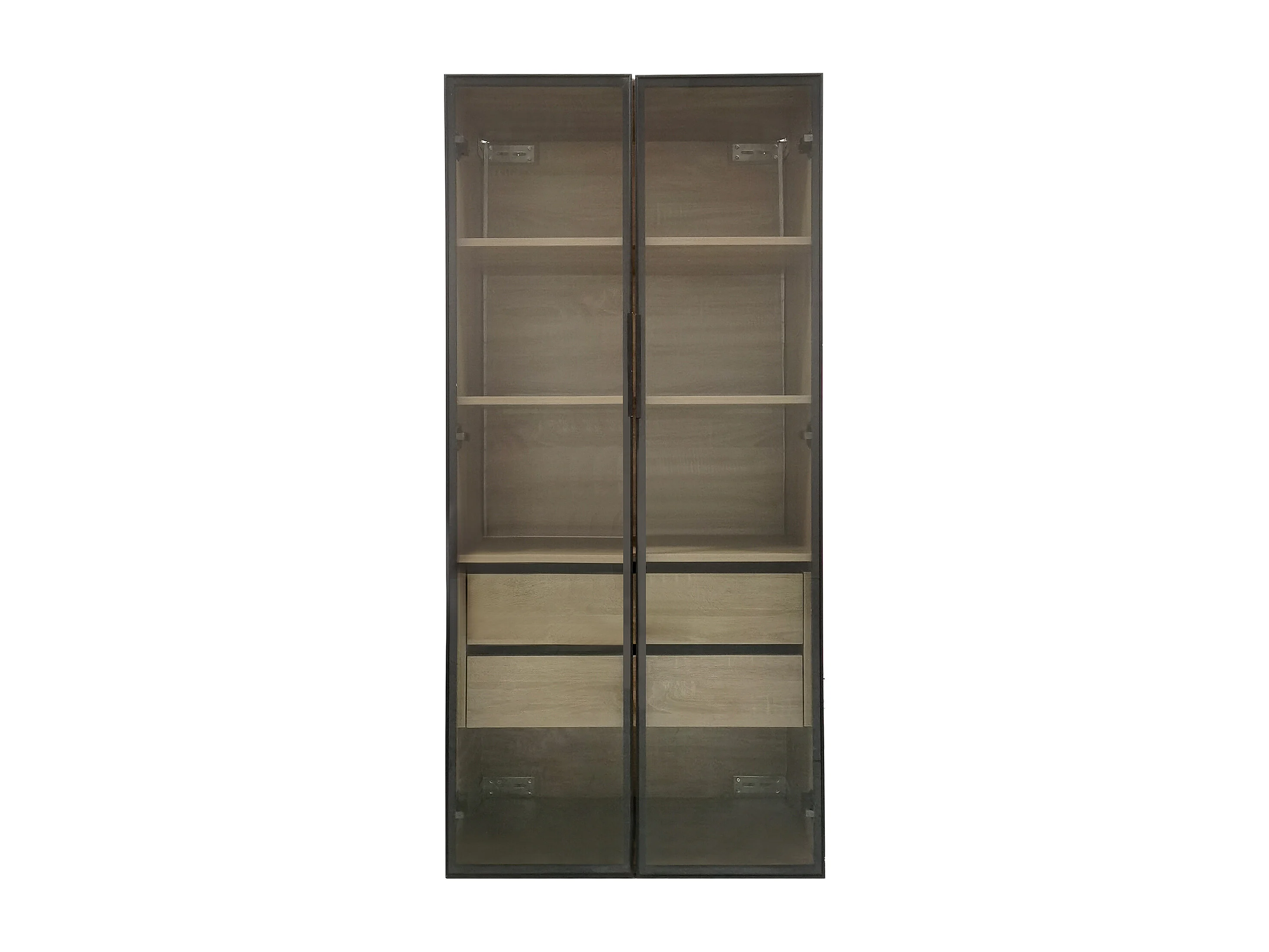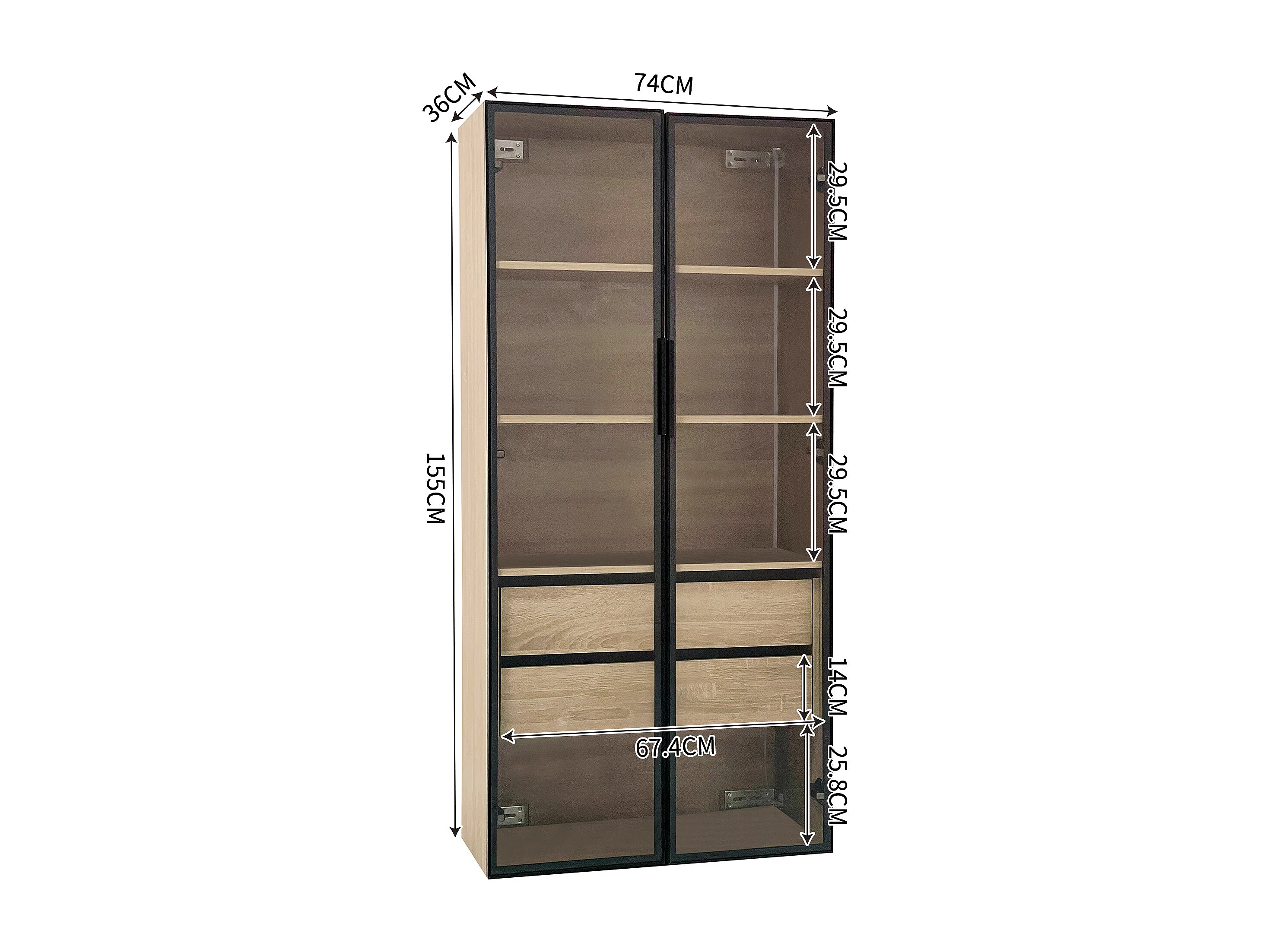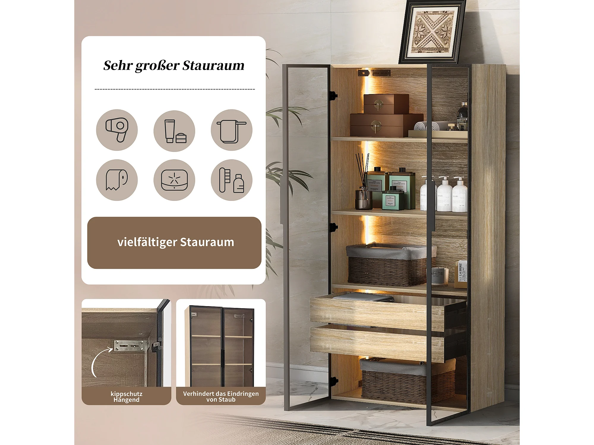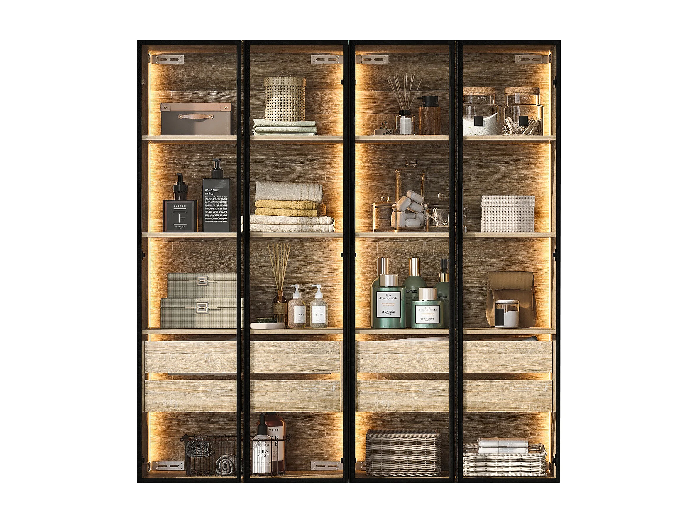 Ensemble de 2 Meubles de salle de bain avec LEDs - 148 x 36 x 155 cm - 4 grands tiroirs et 4 portes vitrées - bois MDF - naturel