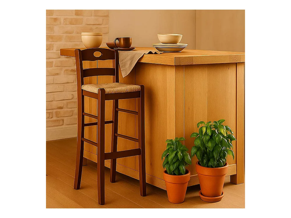 Ensemble de 2 tabourets de bar en noyer foncé, hauteur 80 cm, avec un trou et une assise en paille.
