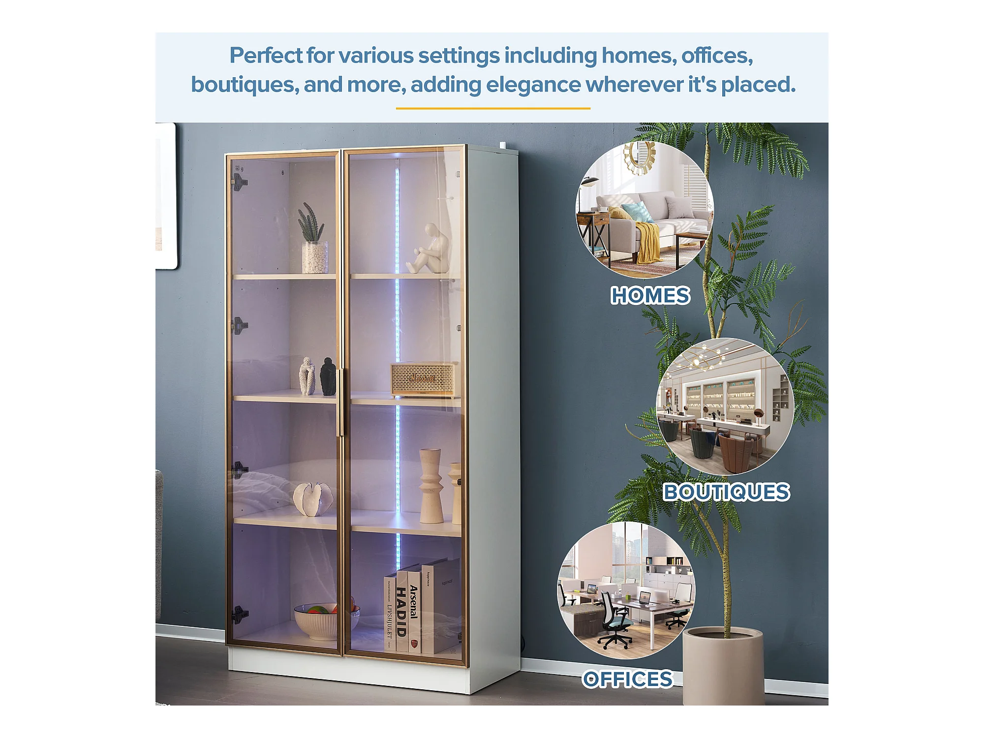 Vitrine à LED 2 portes bois vernis brillant blanc et doré Jade 60cm