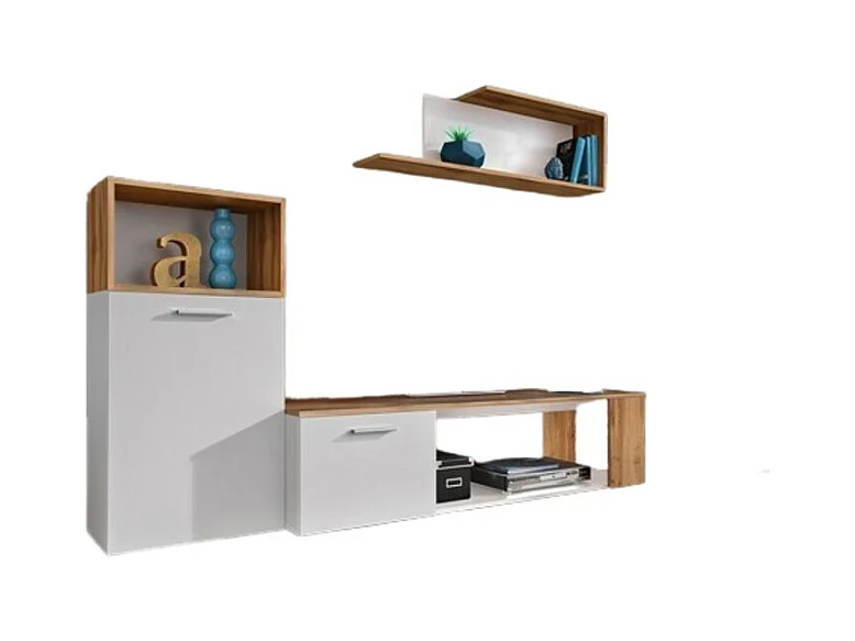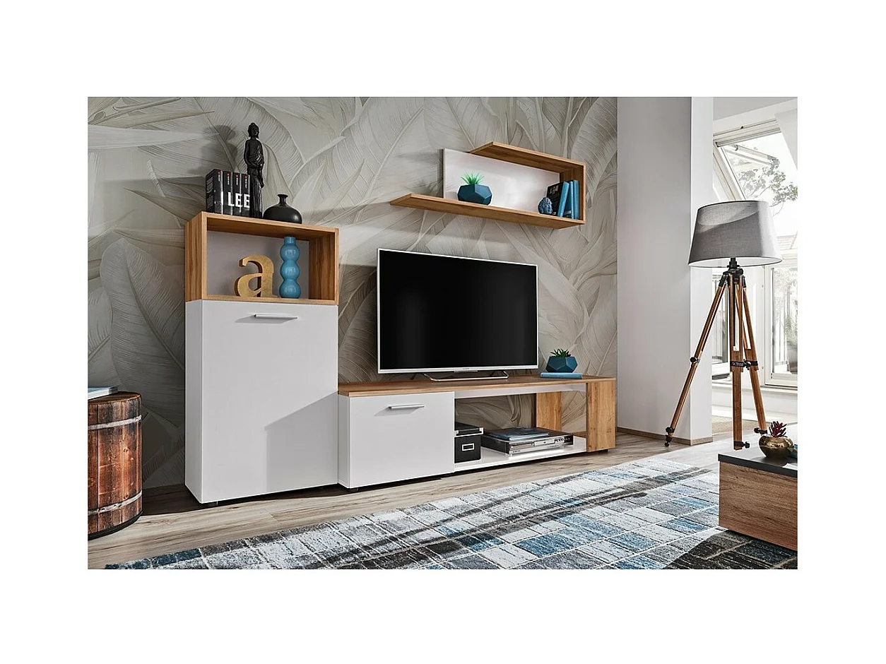 Ensemble de 3 meubles design pour votre salon collection MOZES. Coloris blanc et chêne