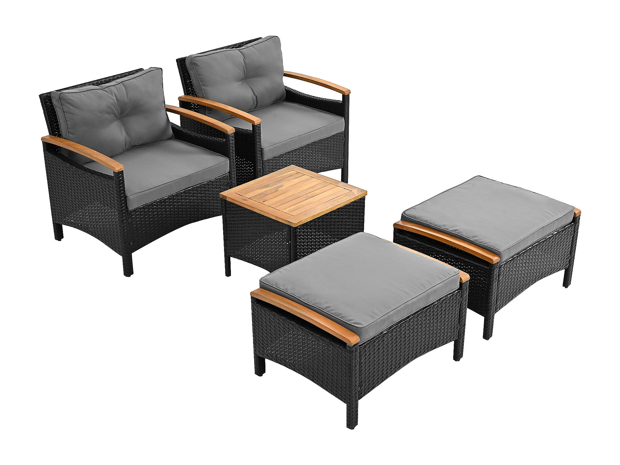 Ensemble de balcon en rotin (5 pièces), plateaux en bois d'acacia, coussins gris, capacité de charge de 160 kg
