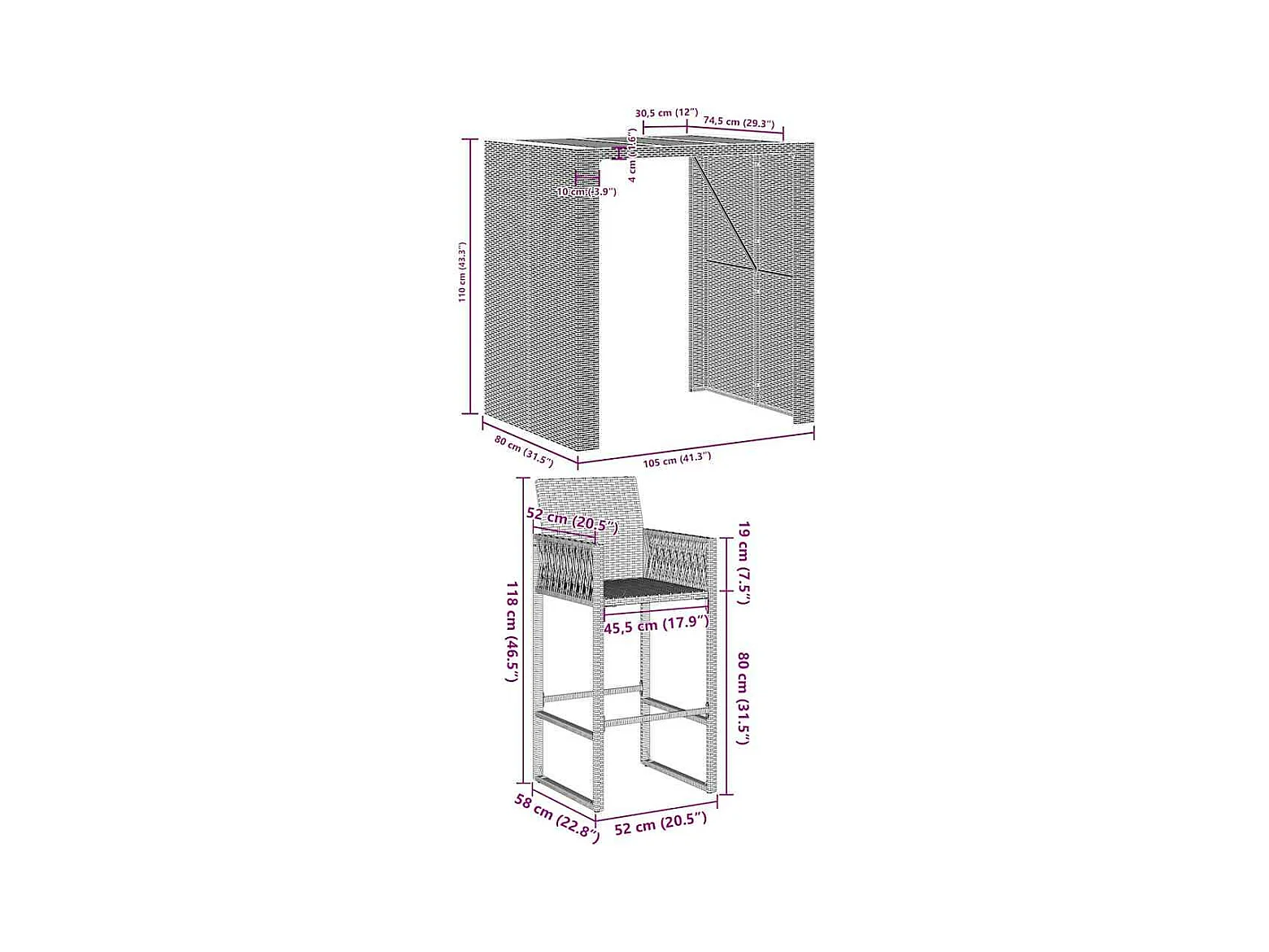 Ensemble de bar de jardin 3 pcs et coussins gris résine tressée
