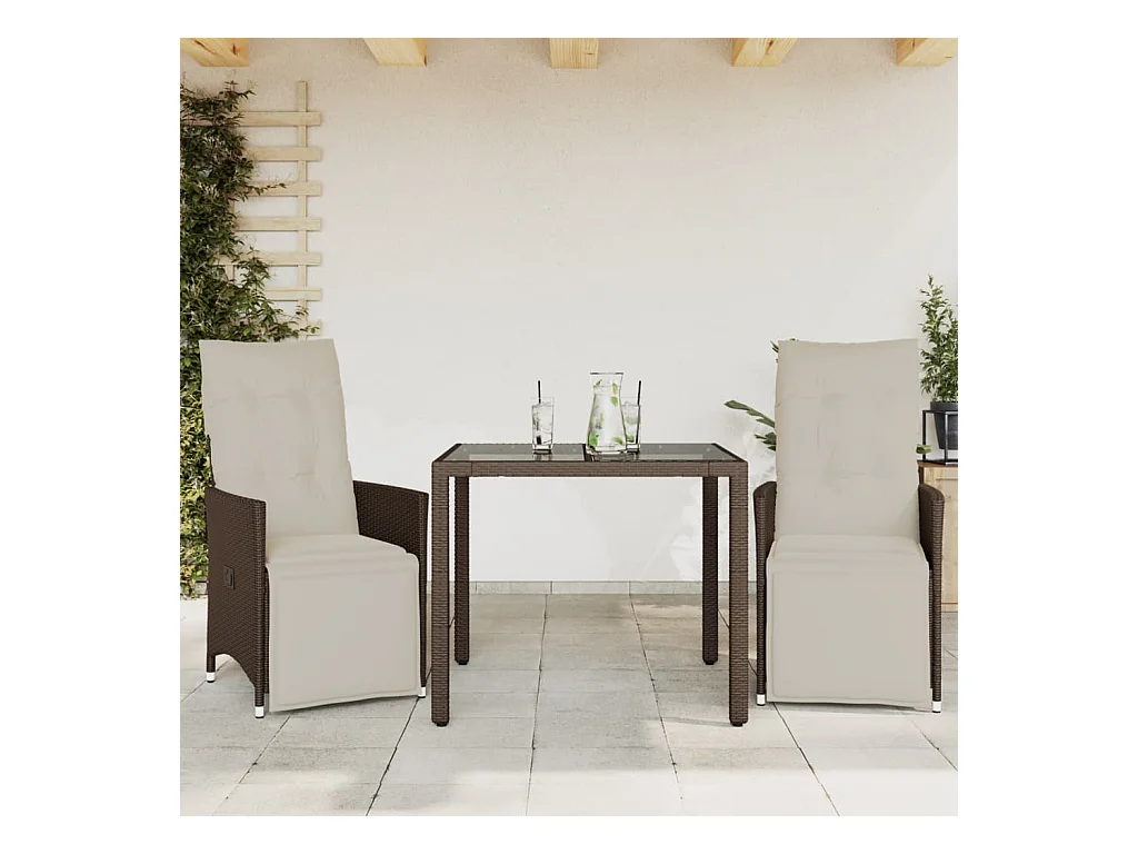 Ensemble de bistro avec coussins 3 pcs marron rotin et verre FR26392