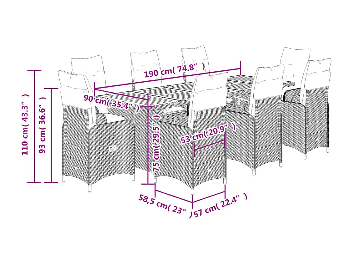 Ensemble de bistro de jardin 9 pcs coussins gris poly rotin