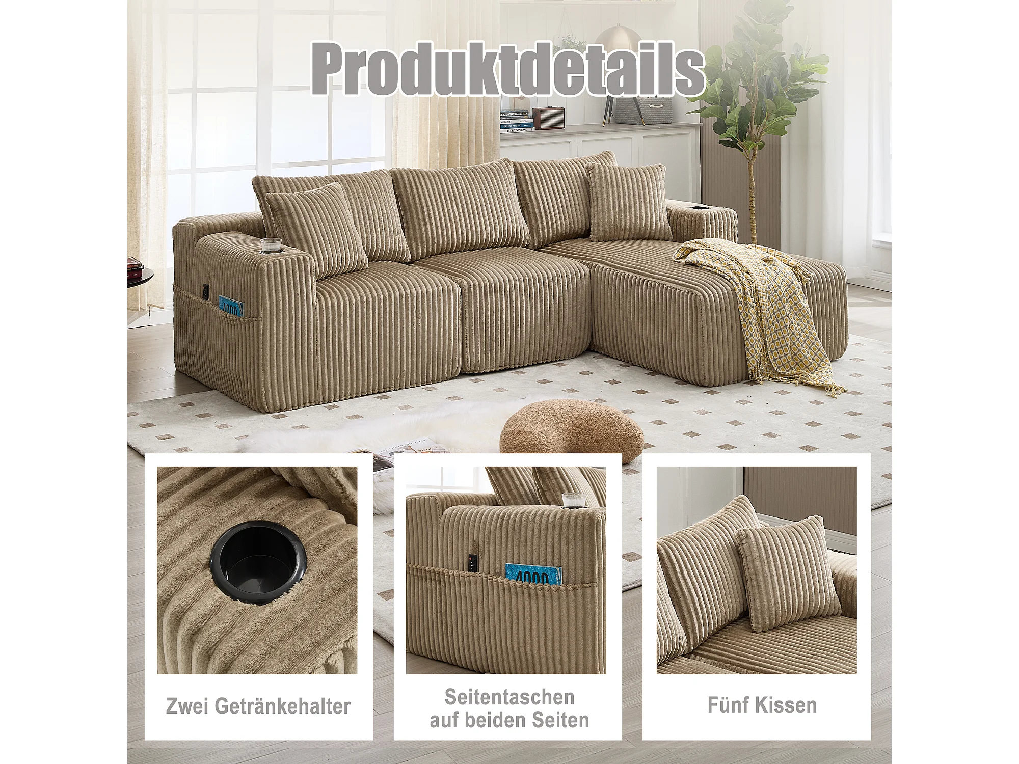 Ensemble de canapé 3 places - 257 x 160 x 80 cm - avec 5 coussins - combinaison à faire soi-même - velours - kaki