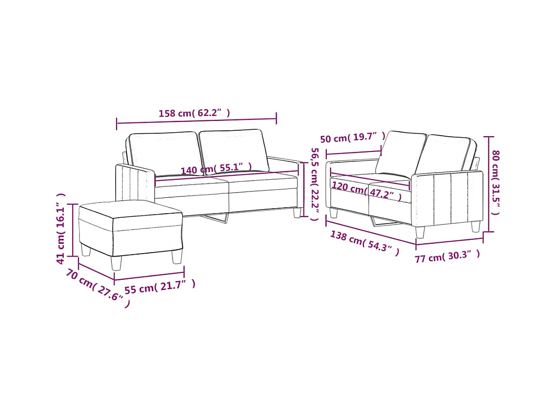 Ensemble de canapés 3 pièces avec coussins gris clair velours