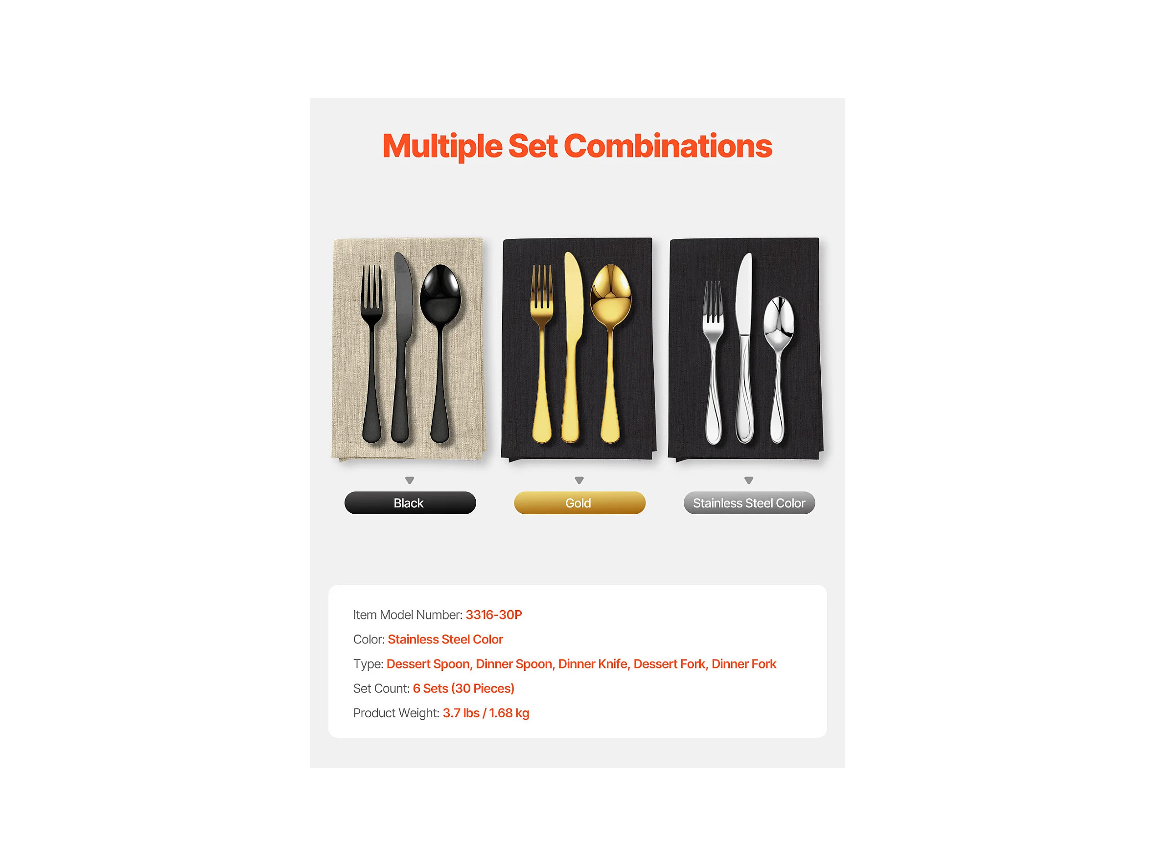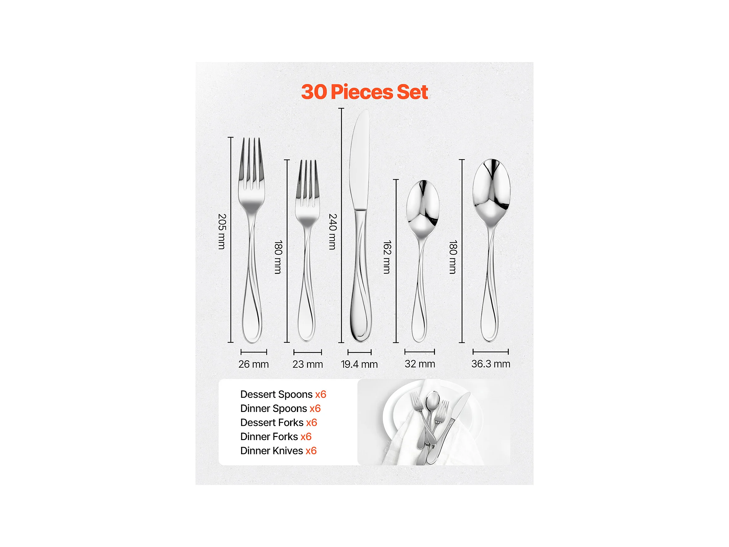 Ensemble de Couverts SucceBuy Ménagère 30 Pièces en Acier Inoxydable, Couverts pour 6 Personnes, Ustensiles de Cuisine.