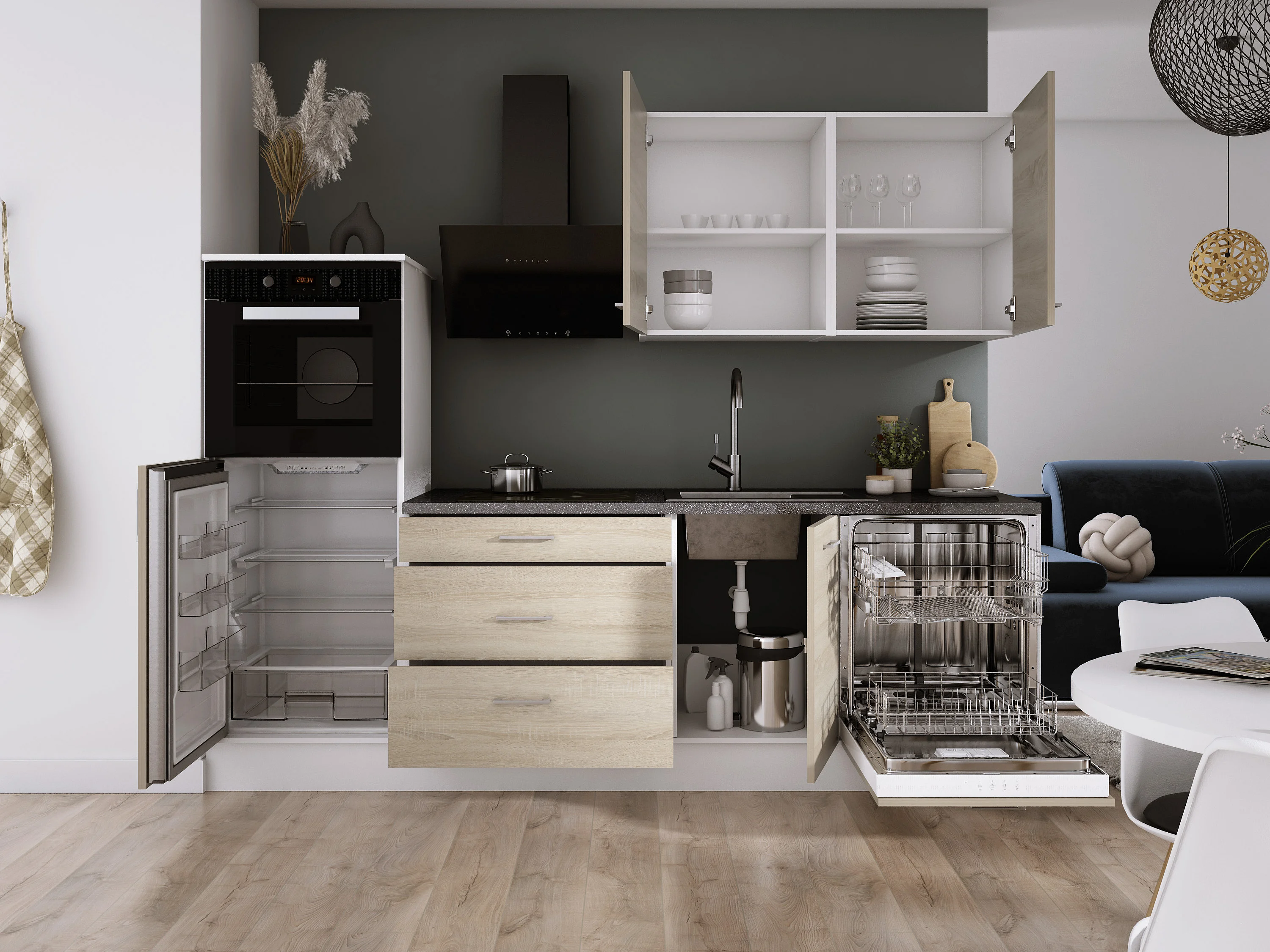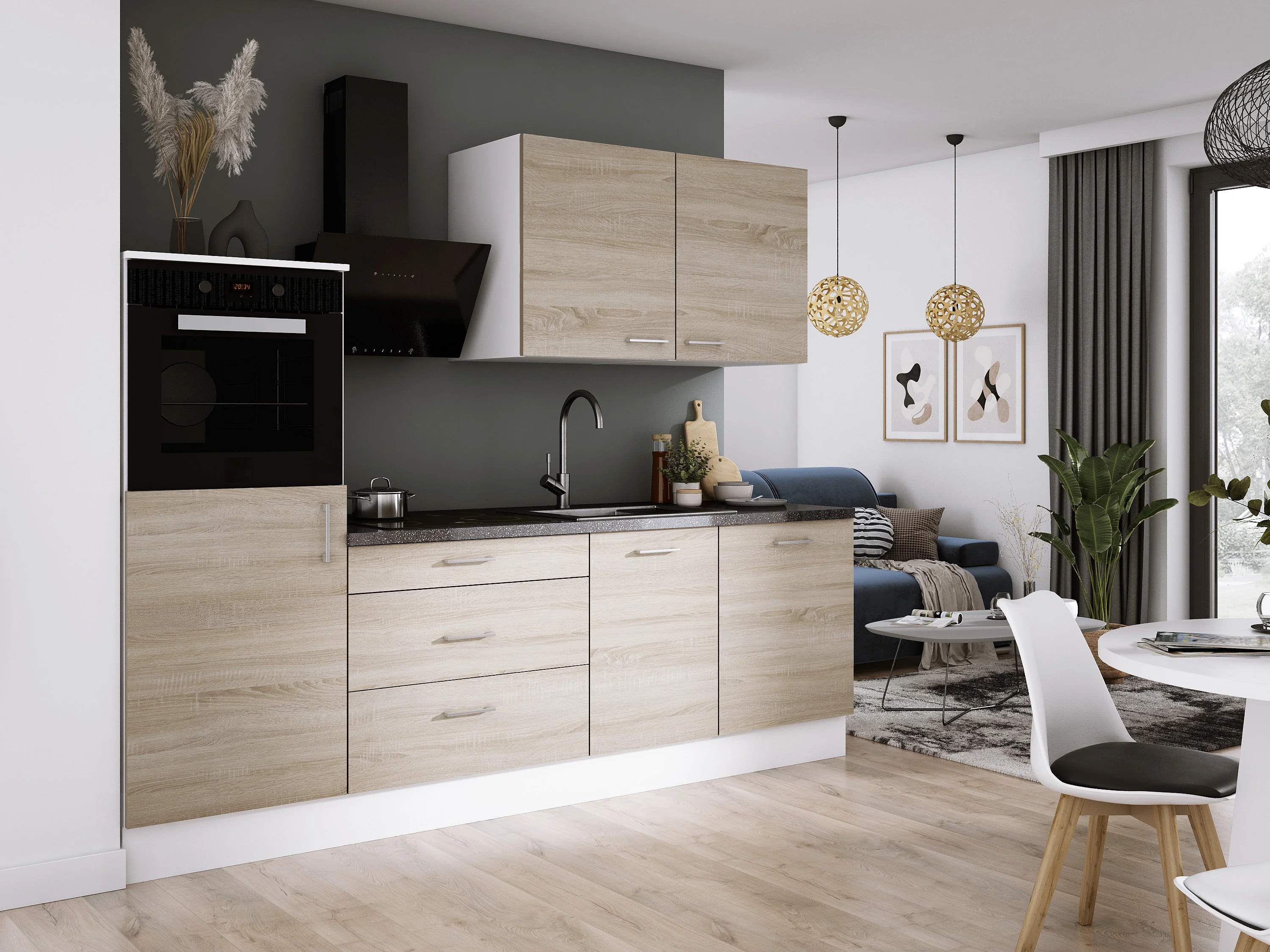 Ensemble de cuisine : Blanc Mat, Chêne Sonoma, d : l : 250 cm, h : 220 cm, p : 60 cm