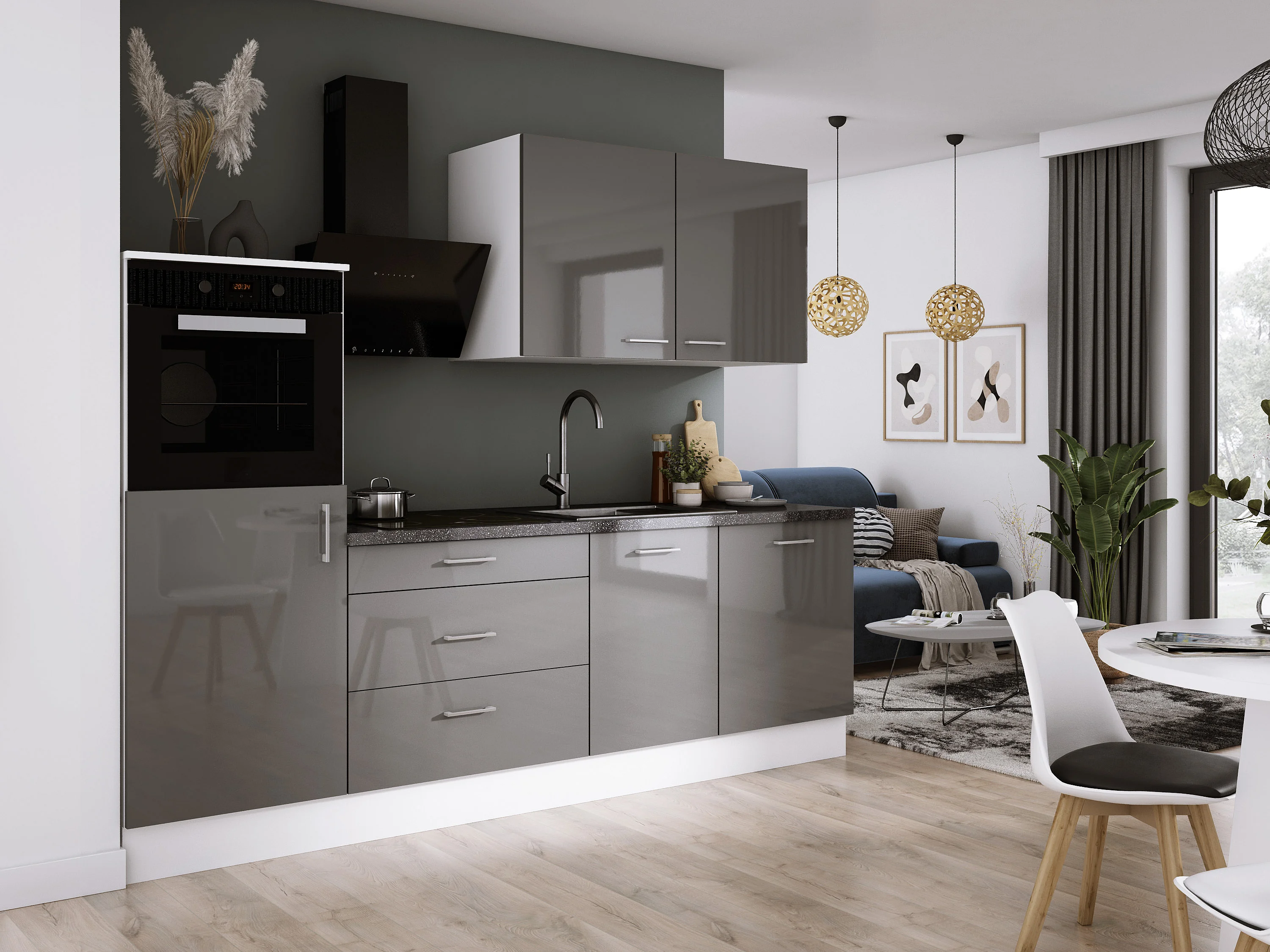 Ensemble de cuisine : Blanc Mat, Gris Brillant, d : l : 250 cm, h : 220 cm, p : 60 cm