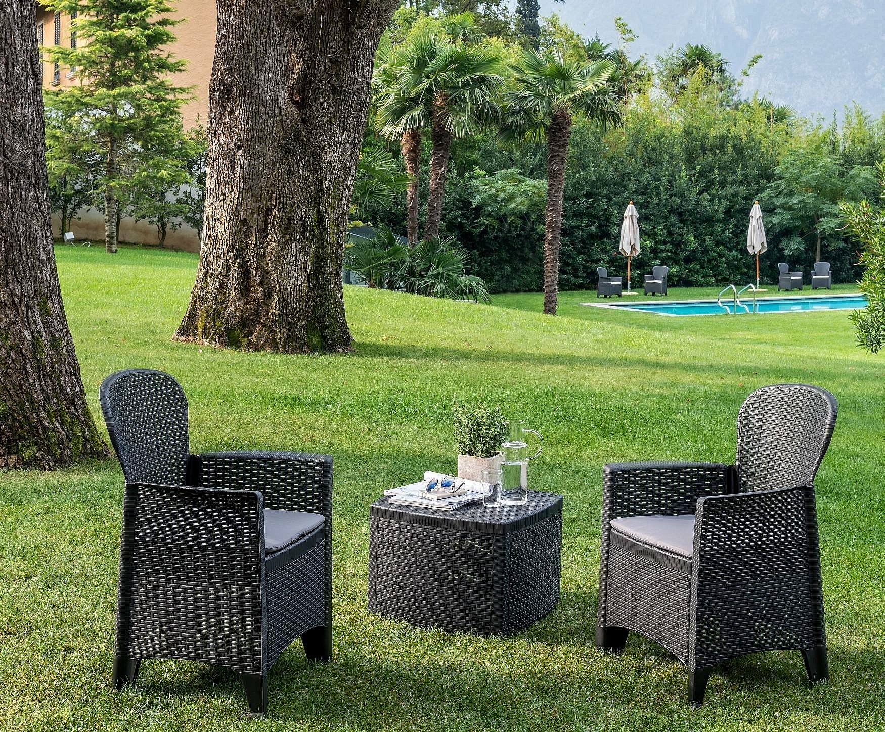Set salon d’extérieur Dakain, Salon de jardin composé de 2 fauteuils et 1 table conteneur, Salon effet rotin, 100% Made in Italy, Anthracite