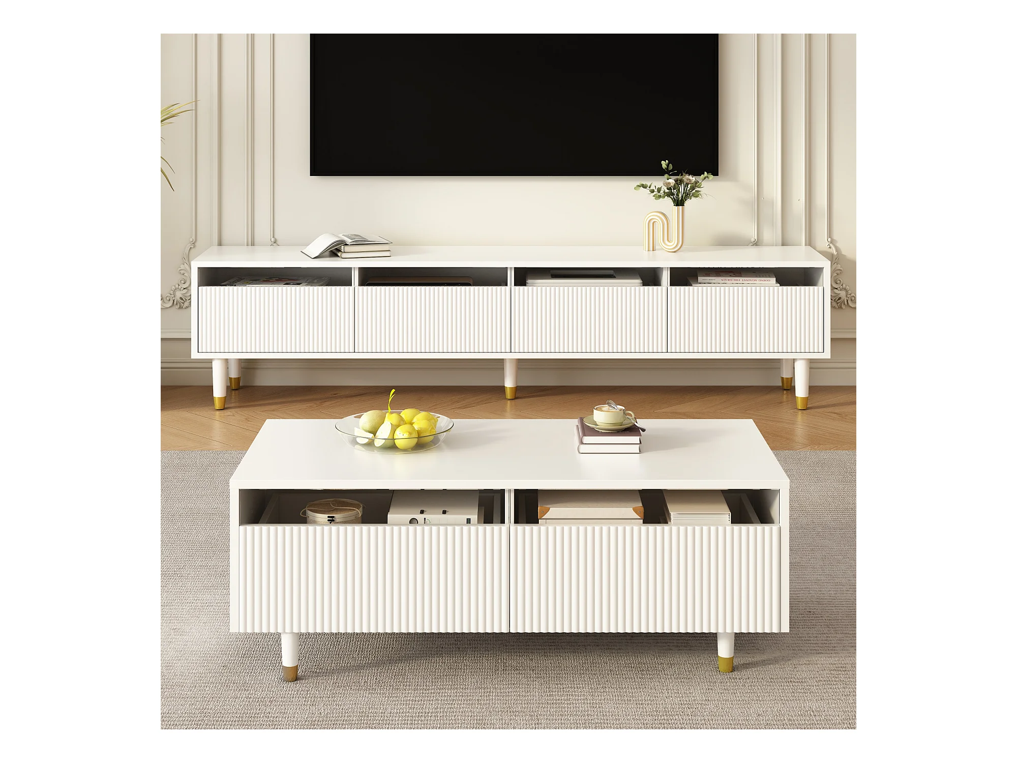 Ensemble de meuble TV avec 4 tiroirs + table basse avec 2 tiroirs - avec Leds - MDF - blanc