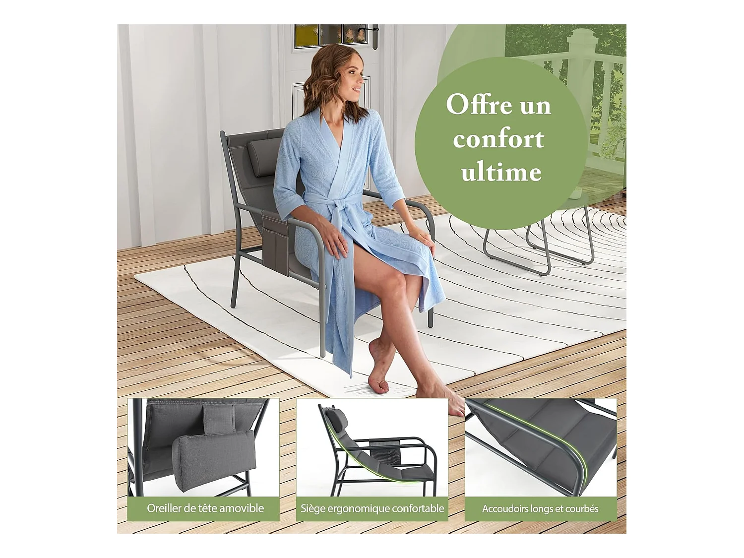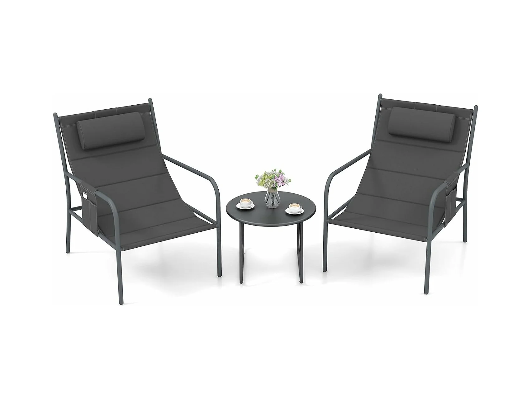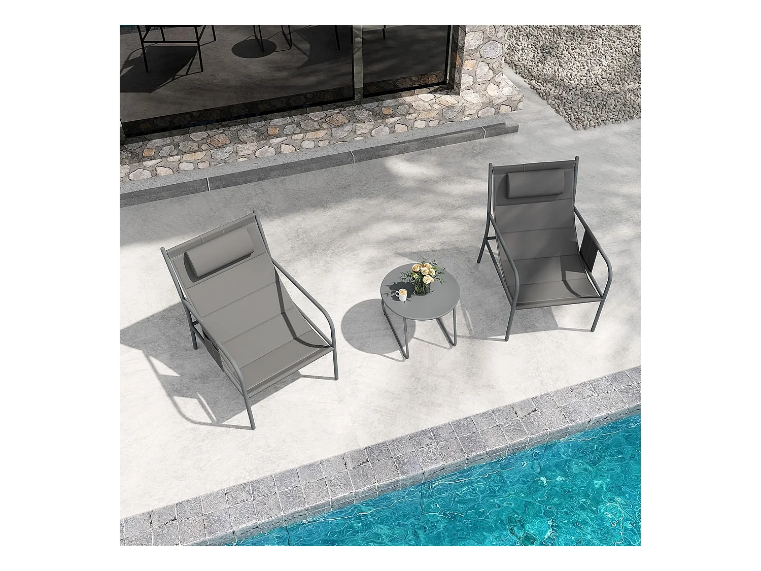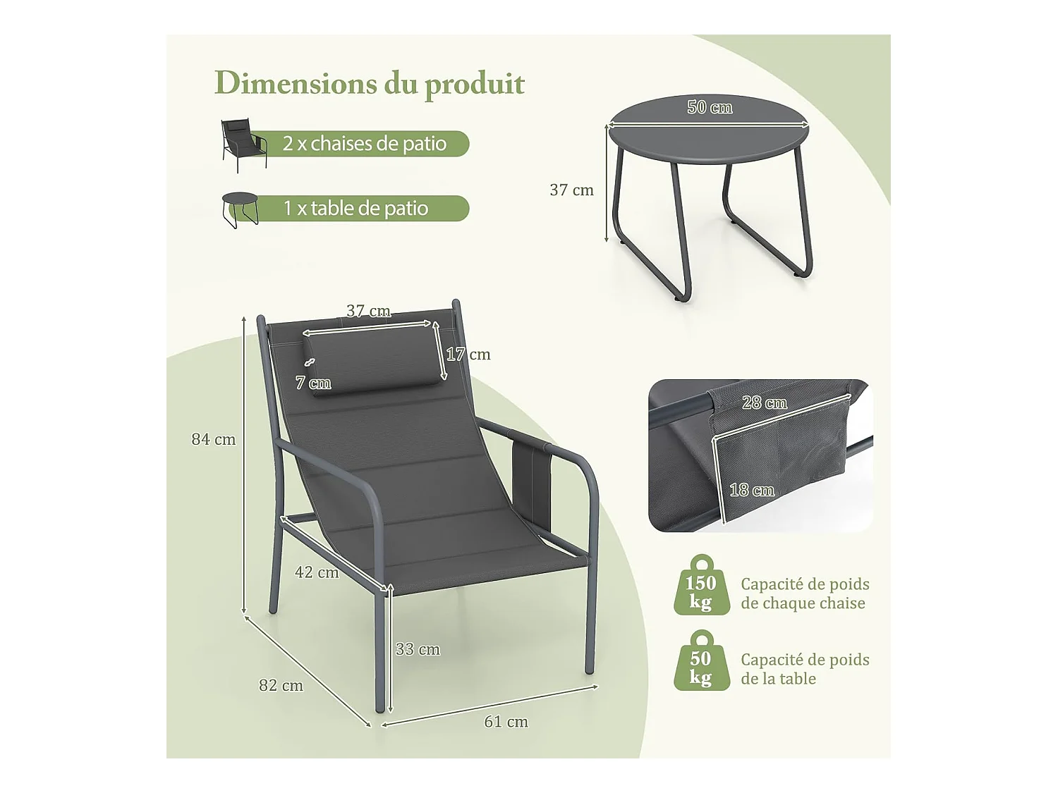 Ensemble de Meubles 3 Pcs de Patio Cadre en Métal Charge 150KG, Salon de Jardin 2 Chaises 1 Table Basse avec Tissu Respirant et Appui-Tête, pour Jardin Balcon, Gris