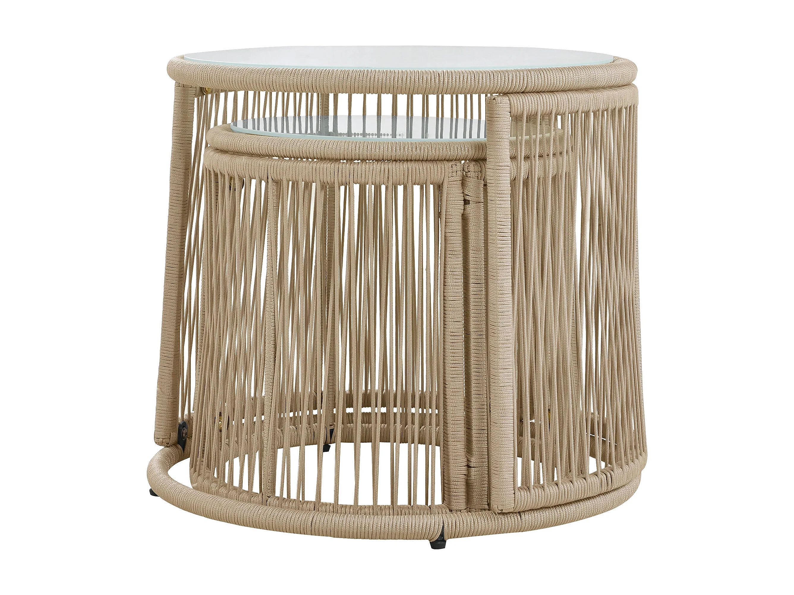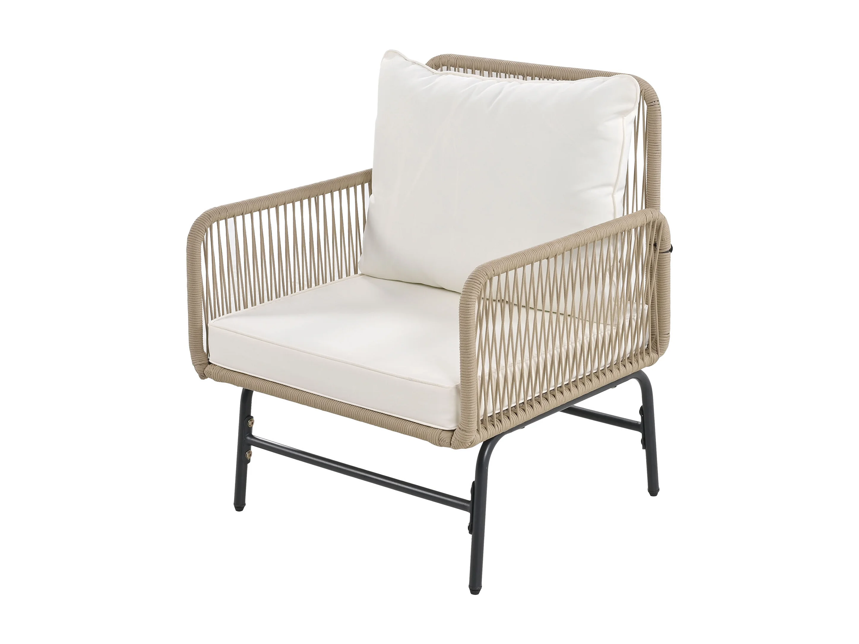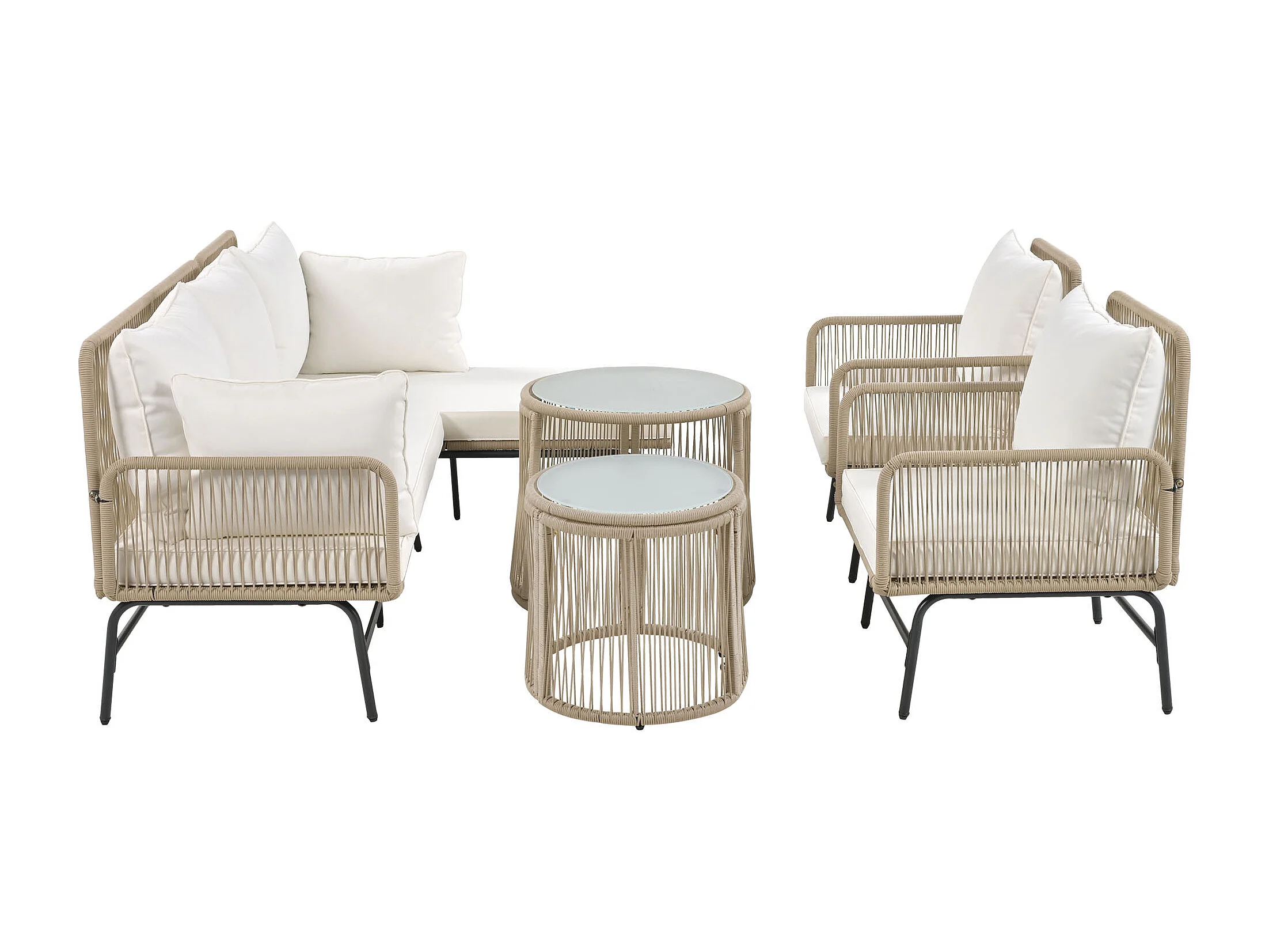Salon de jardin 6 pièces, modulable, coussins inclus, assise profonde, cadre en fer, beige