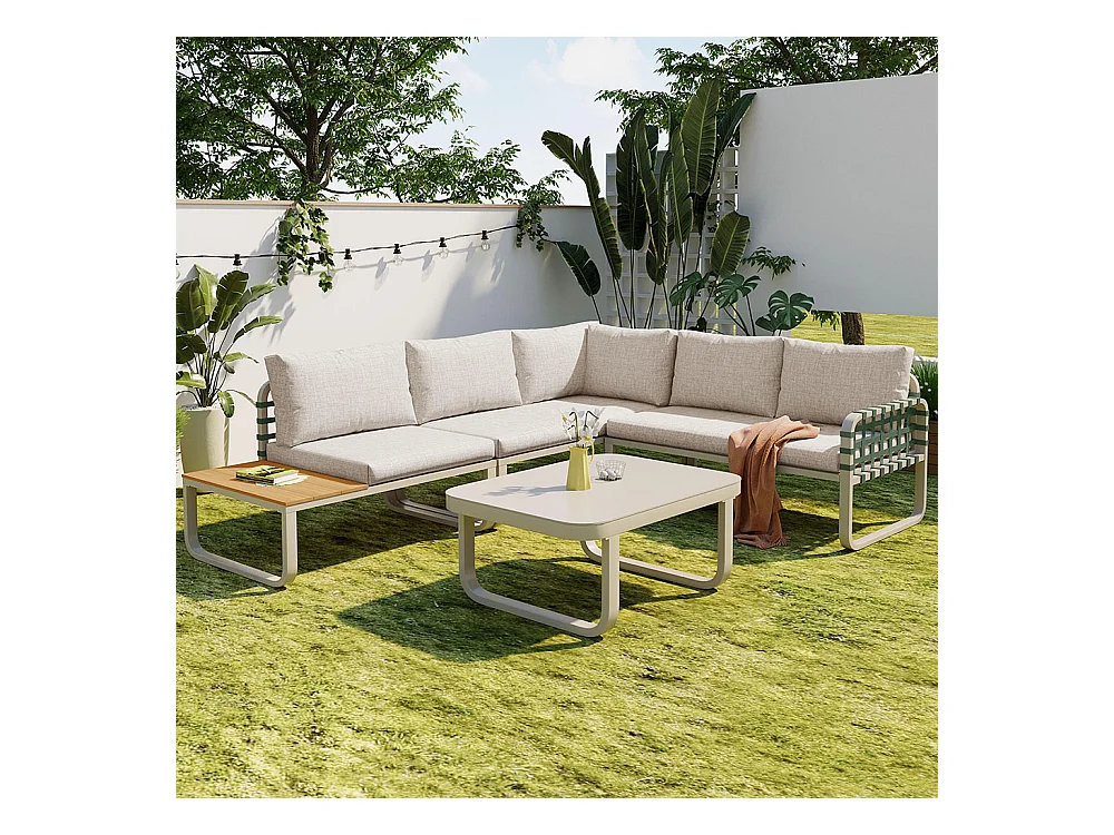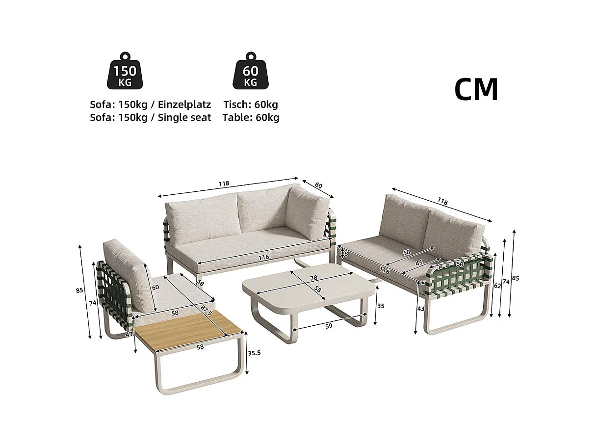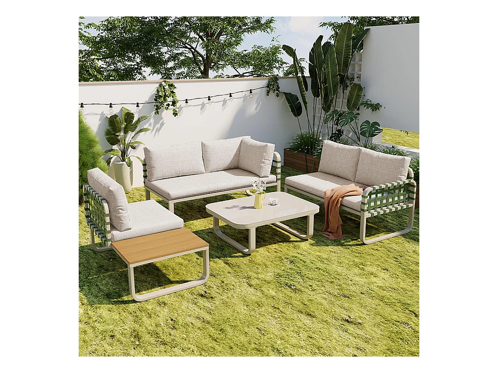 Ensemble de meubles de jardin en rotin en cuir vert (4-5 places), y compris tous les coussins d'assise et les coussins, couleur abricot