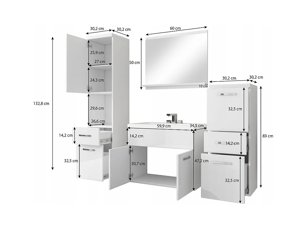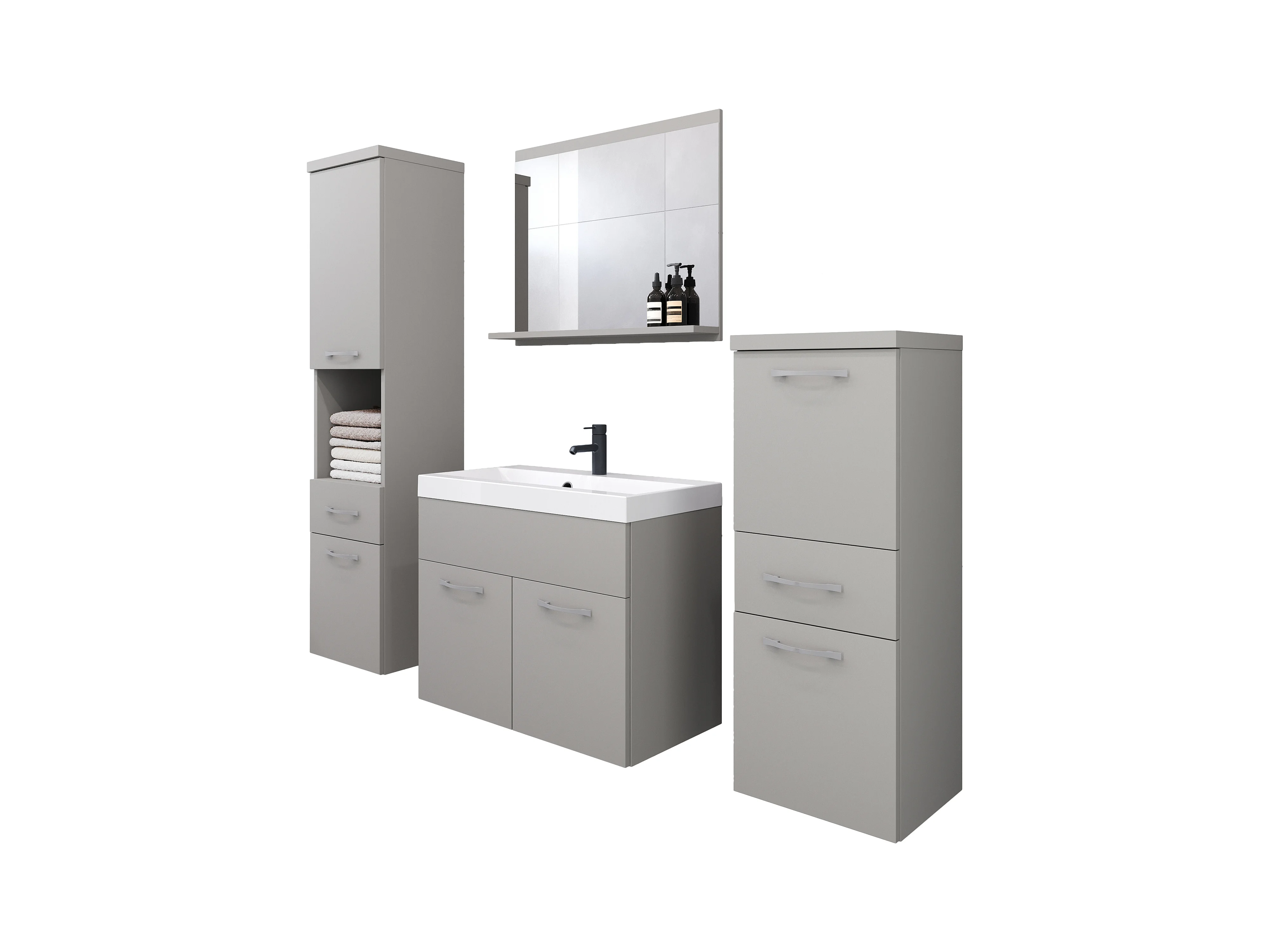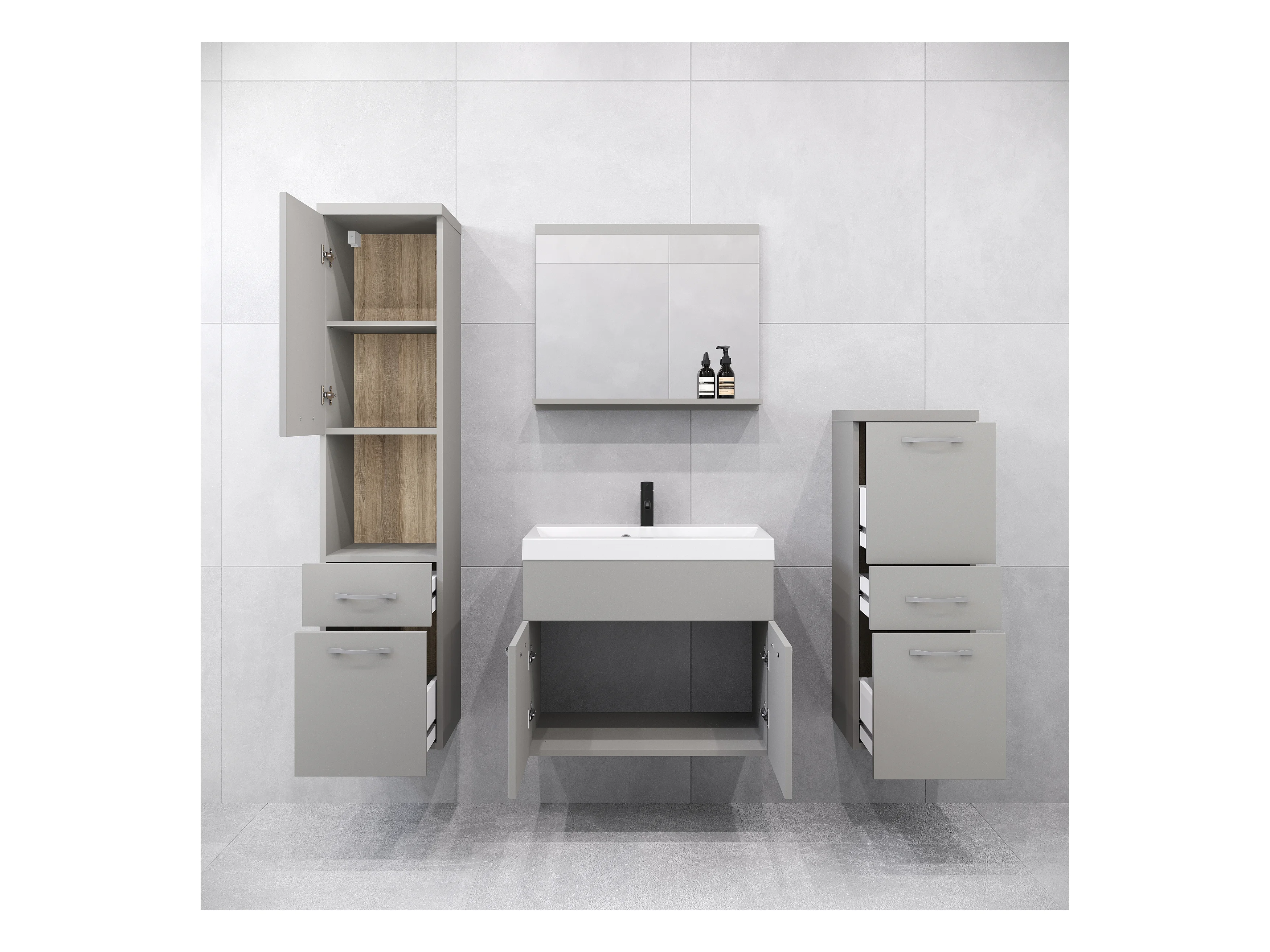 Ensemble de salle de bain, meubles suspendus avec lavabo, 2 colonnes et miroir avec étagères, gris pallad mat