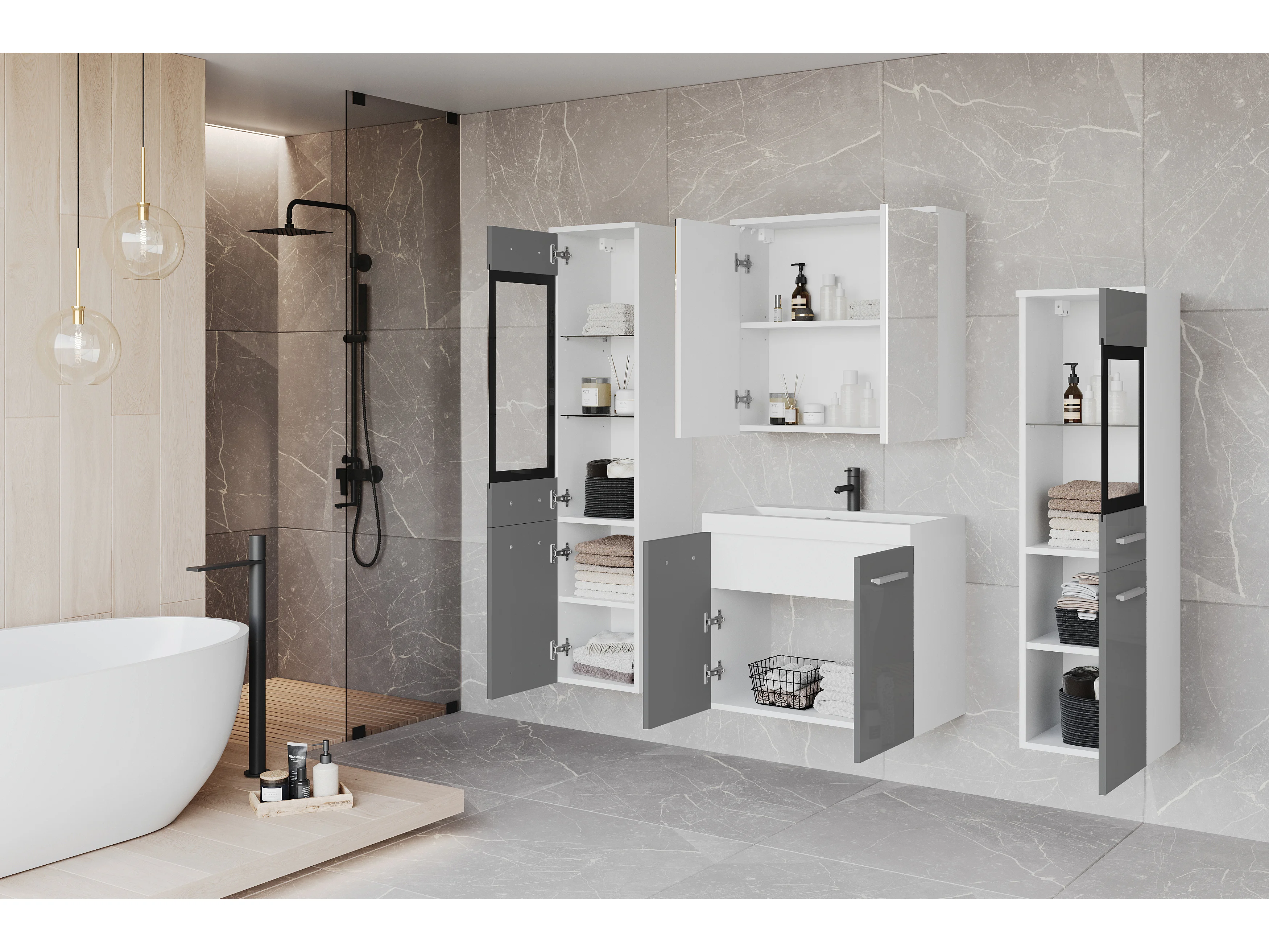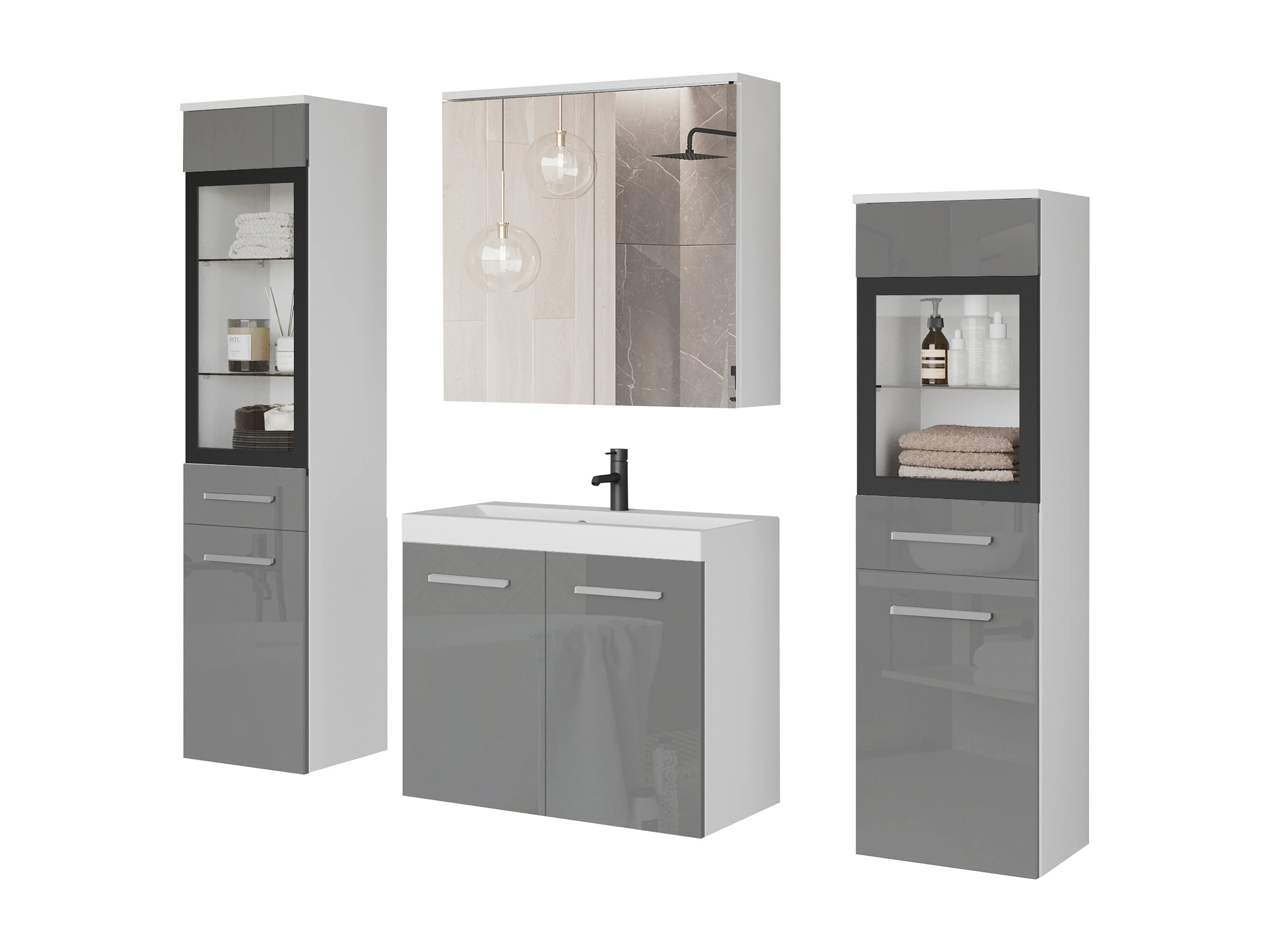 Ensemble de salle de bain suspendu avec lavabo, 2 colonnes et armoire miroir, caisson blanc mat / façades gris brillant